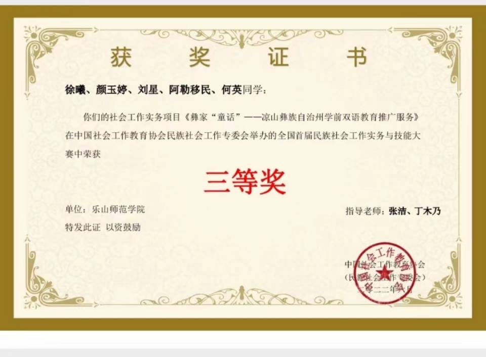 会议最后,公布了全国首届民族社会工作实务与技能大赛获奖名单。该竞赛从去年7月组织申报,经过了初赛和决赛两个环节,最后由我系教师张洁、丁木乃指导,由学生徐曦、颜玉婷、刘星、阿勒移民、何英共同完成的“彝家‘童话’——凉山彝族自治州学前双语教育推广服务”项目获得了全国首届民族社会工作实务与技能大赛三等奖。