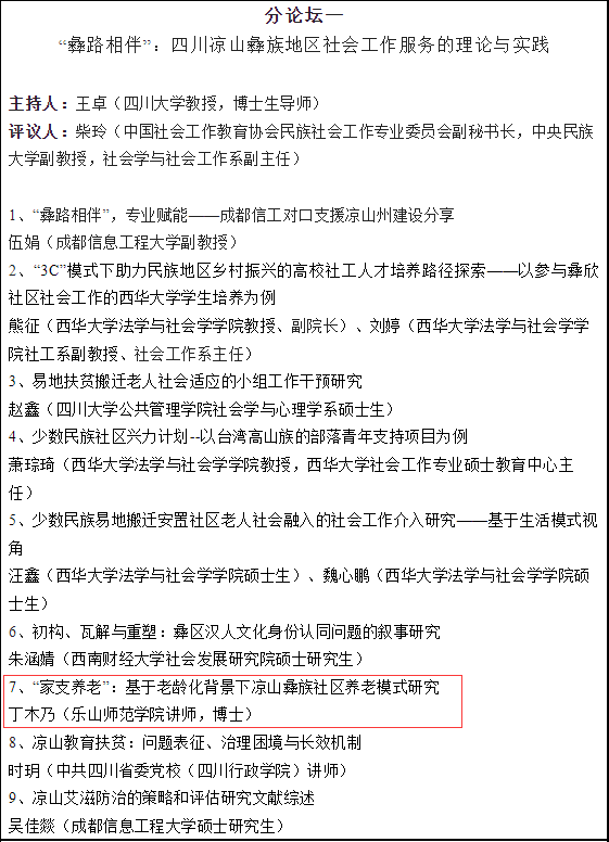 我院组织社会工作专业教师团队和部分学生参与了此次会议。上午,开幕式结束后,听取了钱宁教授“社会赋权视角下民族社会工作如何促进少数民族社会的高质量发展”、任国英教授“民族社会工作的中国化路径”、焦若水教授“走出民族社会工作的文化迷雾”等6场主题报告。我系教师代表丁木乃博士,在下午的分论坛“彝路相伴:四川凉山彝族地区社会工作服务的理论与实践”中,做了题为“‘家支养老’:基于老龄化背景下凉山彝族社区养老模式研究”的论文发言,并简要介绍了我系社工专业人才培养情况,与会议主持人四川大学王卓教授、评议人中央民族大学柴玲副教授,进行了学术交流。