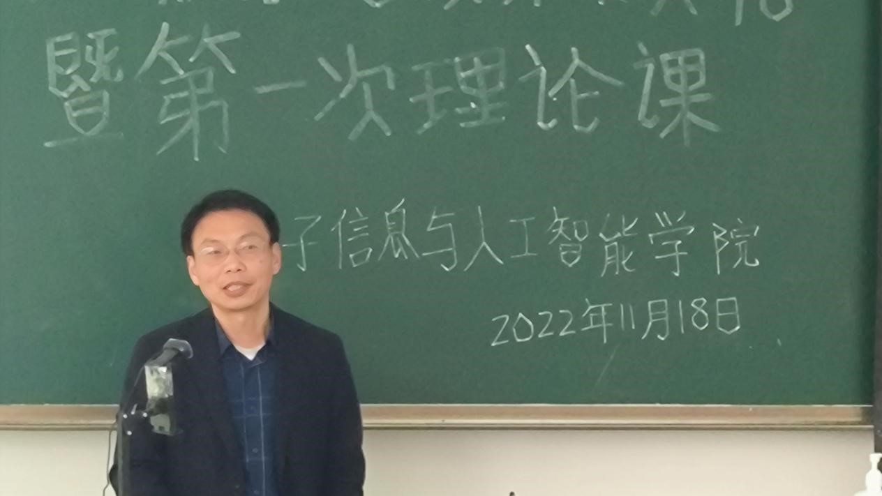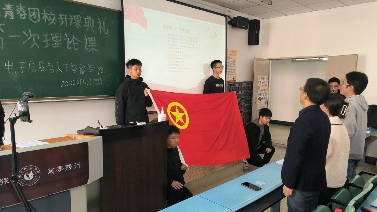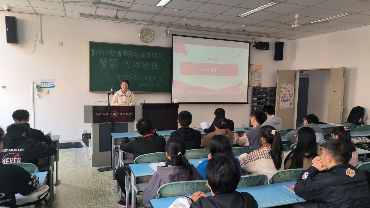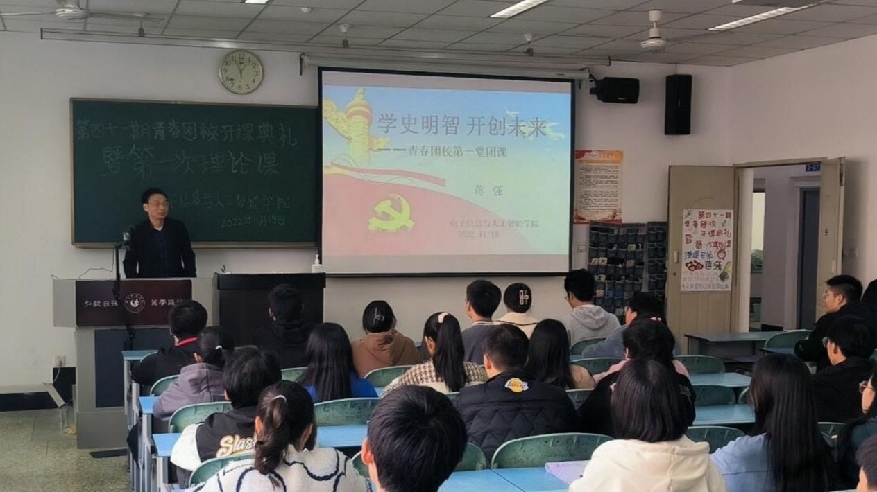 本网讯(文/邱凤琳 图/张哲维)为响应党的二十大精神要求,对团员进行思想政治教育以及团的基本知识教育,提高团员思想理论水平和政治素质。电子信息与人工智能学院于11月18日在行知楼308开展第四十一期青春团校第一次理论课活动,参加本次活动人员有电子信息与人工智能学院党委书记蒋强,辅导员雷雄锴,肖苗以及团校第41期学员,分团委组织部副部长段青松主持本次团课学习。