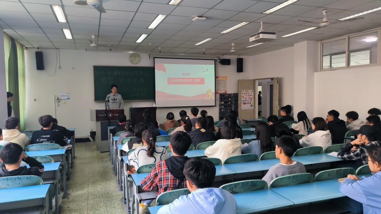 活动开始,段青松向学员介绍到场嘉宾。随后进行活动第一项,全体起立迎团旗、唱团歌。活动进行下一项,由肖苗代表学院党委书记方忠进行开班致辞,随后肖苗向全体学员介绍青春团校的目的和意义,带领学员们回顾入团誓词、介绍团徽以及团旗的由来,接着雷雄锴为学员们宣读团校纪律及学习要求,强调团课评优、推优条件,禁止他人代课,上课迟到早退。活动进入重要环节,蒋强给学员讲授开班第一课,在课上蒋强以“学史明智,开创未来”为题,围绕党的二十大精神,全党同志的三个决心:“不忘初心,牢记使命”“谦虚谨慎,艰苦奋斗”“敢于斗争,善于斗争”教导学员们作为一名合格团员应当具有的时代意识和责任。他说到:“团课不是形式,学习就一定要有成果,需认真对待,严格要求自己,将所学内化于心,外化于行。”活动最后段青松组织学员们进行了课堂讨论,许多同学积极发表了在课堂上的收获心得,大家纷纷表示在以后的生活和学习中,需更加严格要求自己,积极努力向党组织靠拢,为社会和国家贡献一份自己的青春力量。