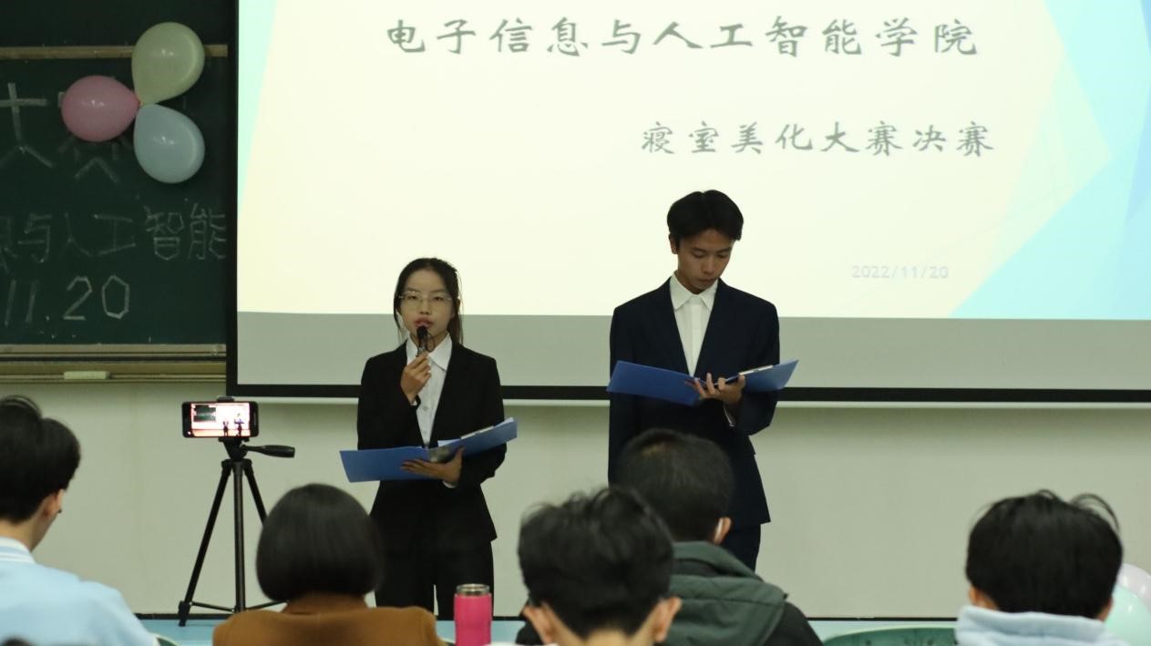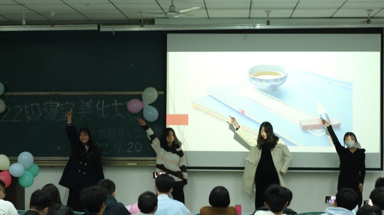 本网讯(文/王业鑫 图/邝园星)为了丰富同学们的课余生活,增强寝室的凝聚力,营造温馨寝室环境,打造经典寝室文化。进一步推进学生寝室精神文明建设,营造良好的宿舍氛围。电子信息与人工智能学院分别在11月20日下午和晚上两个时间段于行知楼125和225教室开展寝室美化大赛初赛和决赛。出席本次活动人员有电子信息与人工智能学院辅导员强光平、雷雄锴、肖苗,22级电信三班班主任张小英、22级电信五班班主任张自友、分团委副书记李梁、副书记成宇豪、学生分会主席彭俊杰、副主席李文倩、易班站长杨玉旭以及个参赛寝室同学。