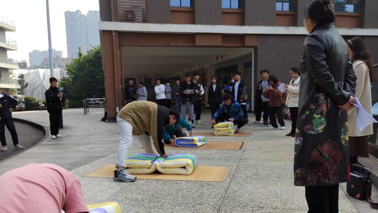 比赛开始前,唐方敏首先向各位选手讲解了比赛需要注意的事项和规则。比赛开始,参赛人员纷纷就绪,随着比赛一声令下,一场叠军被比赛正式拉开帷幕。参赛人员首先将自己的被子用力压住,压缩被子厚度,使被子更紧凑,接着他们开始跟着压纹折叠被子。最后,一床床被子变成了整齐的“豆腐块”呈现在观众眼前,比赛结束,各评委老师细致查看参赛人员的成果,从整齐度和纹理等方面出发为各位参赛人员打分。