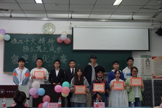大赛伊始,参赛寝室代表队通过PPT展示和演讲展现寝室风貌,并精心准备了才艺表演。最后,学十二310寝室代表队凭借良好的寝室风采和出彩的才艺表演获得此次大赛的第一名,评委为获奖寝室颁发奖状和奖品。