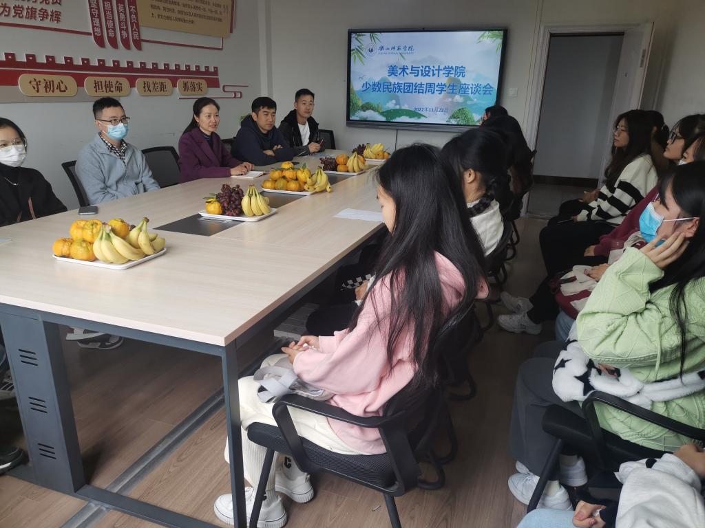 本网讯(文/刘桐江 图/崔玉)为深入学习贯彻党的二十大精神,进一步传承、弘扬民族文化,关心少数民族学生的学习、生活情况,促进各民族学生间的沟通和文化交融,不断强化服务育人的针对性和实效性,美术与设计学院于11月22日中午在旷怡楼302召开少数民族团结周学生座谈会,学院党委副书记王孝琴、全体辅导员以及彝、藏、白、回、苗、壮等少数民族学生代表参加会议。