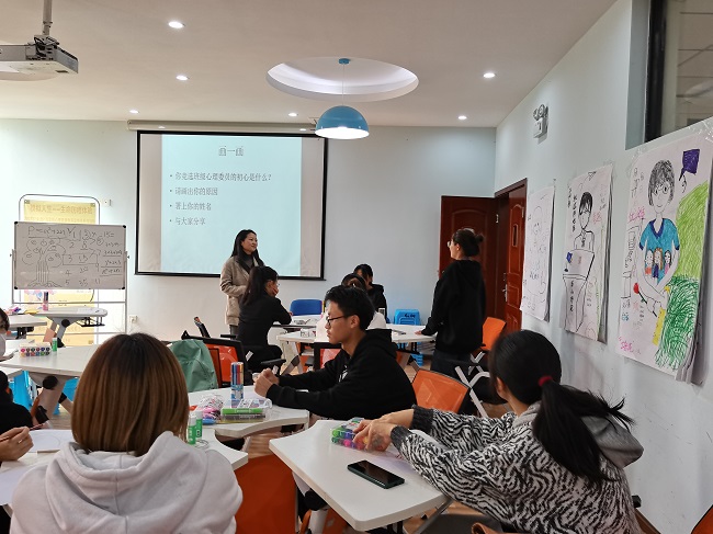 王老师首先请心理委员们在白纸上以绘画的形式表达竞选该职务的初衷,然后逐一分享。随后,王老师详细介绍了我校心理健康教育体系,着重强调朋辈心理健康辅导的重要性和可操作性。接着,王老师播放了本届“十佳心理委员”马丽萍师姐的先进事迹视频。最后,王老师提醒大家关注“高校心理委员工作平台”公众号,并明确相关工作要求。
