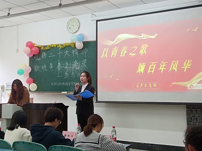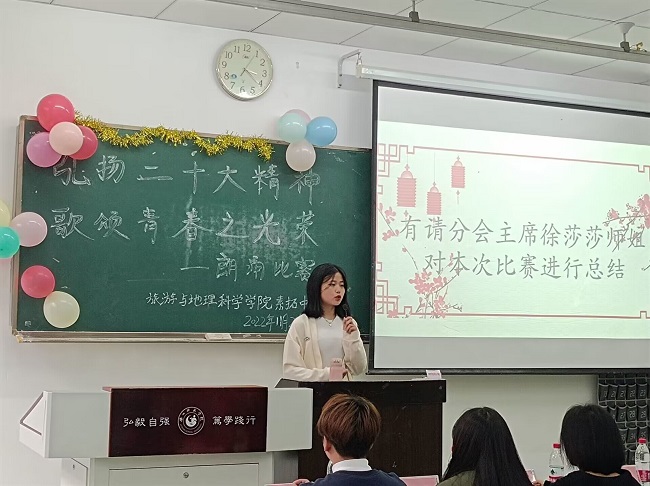 本网讯(文/吉宜洋 图/斯芯素)日月开新元,万象启新篇。为进一步组织旅地学子学习贯彻党的二十大精神,旅游与地理科学学院于11月26日下午在行知楼108教室组织开展了以“学习党的二十大精神,谱写壮丽青春之歌”为主题的朗诵比赛。比赛由李佳嵘同学主持,担任比赛评委的是学生分会主席徐莎莎,传媒中心易班技术部部长苏椿翔以及分团委各部部长。