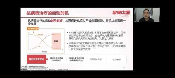 易斌医生在讲座中详细地为同学们介绍了什么是HIV,并分别从感染后不同阶段的临床表现、治疗手段以及药物价格和选择等多方面进行分析。其中在药物价格和选择部分,重点提及到了国家在HIV药物上出台的相关政策和对民生的保障。特别解释了HIV和艾滋病的区别,真正落实科普教育的意义。通过展示HIV/AIDS患者生命状况进展图,直观体现出积极治疗的意义。易斌医生还特别强调,“抗病毒治疗的启动越早越好,从而保护免疫力不被病毒摧毁,并阻止病毒进一步发展。”接着介绍了快速启动ART的益处,从最大程度上保障生命安全。