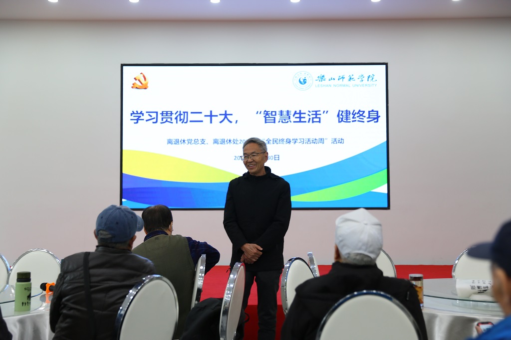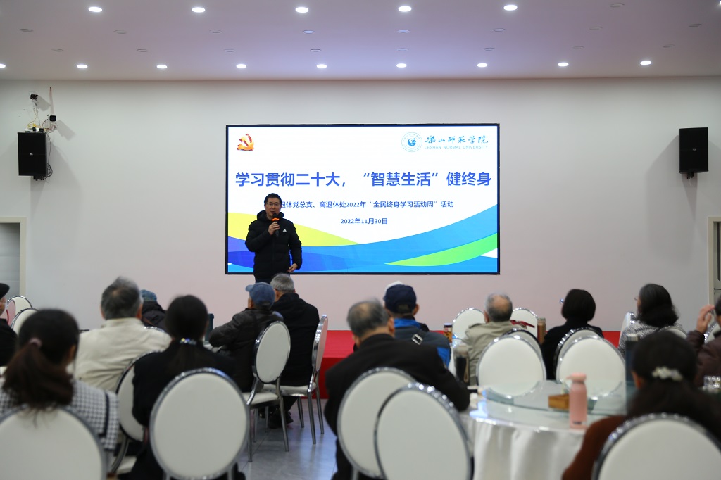 本网讯(文/王德明 图/刘静)11月30日,离退休党总支举办了“学习贯彻党的二十大 智慧生活健终身”全民终身学习活动,离退休工作处全体人员以及离退休老同志60余人参加了活动。