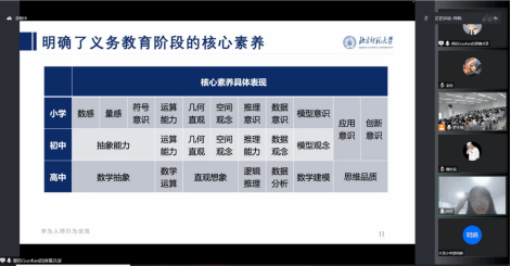 本网讯(文、图/罗天琦)为落实党的二十大报告精神,切实帮助学院师范生成长,12月6日下午,数理学院特邀北京师范大学博士生导师郭衎为数应专业师范生和数理学科教学法团队教师作了题为“聚焦核心素养——《义务教育数学课程标准(2022年版)》修订解读”的讲座。本次讲座采用线上与线下相结合的方式进行,大三的同学在行知楼325教室参会,大四实习生和其他感兴趣的师生远程线上参加。本次讲座由罗天琦主持。