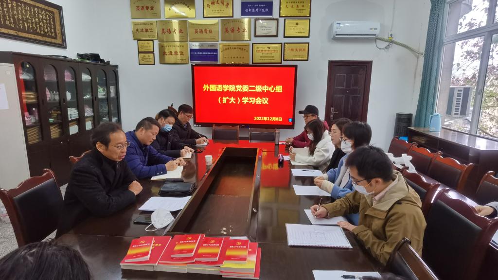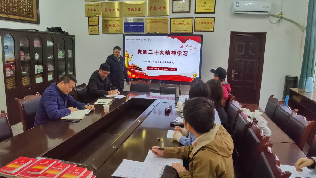 本网讯(文/图 陈开富 曾云超)12月8日下午,外国语学院党委在学院会议室举行了党委中心组(扩大)学习会。党委常委、宣传部统战部部长佘万斌,外国语学院处科级干部、系部主任和教师代表参加了学习会。本次学习会的主题是:学习贯彻党的二十大精神,探索“讲好中国故事,传播中国声音,塑造中国形象,落实新时代海外统战工作”的外院方案。学习会由外国语学院党委书记熊文主持。