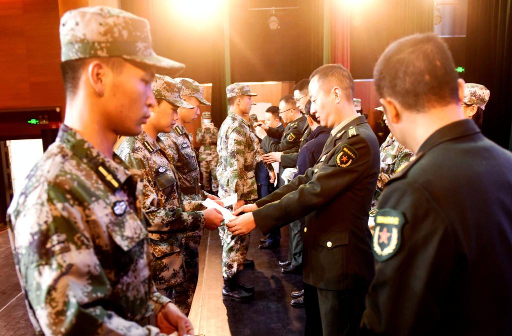 与会领导为第十八期军事特长生颁发入队证书和佩戴标志服饰