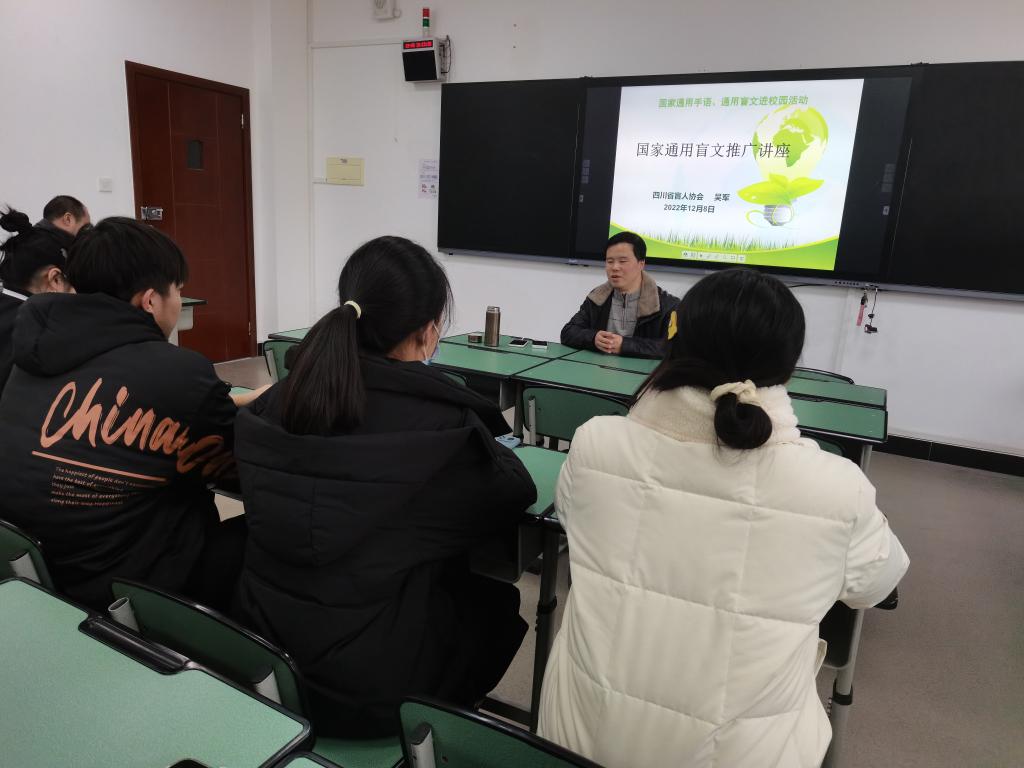 本网讯(文/周丽岚 图/王鑫岚) 12月8日下午3点,特殊教育学院在特教大楼A栋406、501教室举办“国家通用手语、通用盲文进高校系列活动”的第二期专题讲座。本次讲座邀请到四川省盲人协会主席吴军,四川省手语研究与推广活动基地专家、成都金沙遗址博物馆手语讲解员史宇明两位专家主讲。