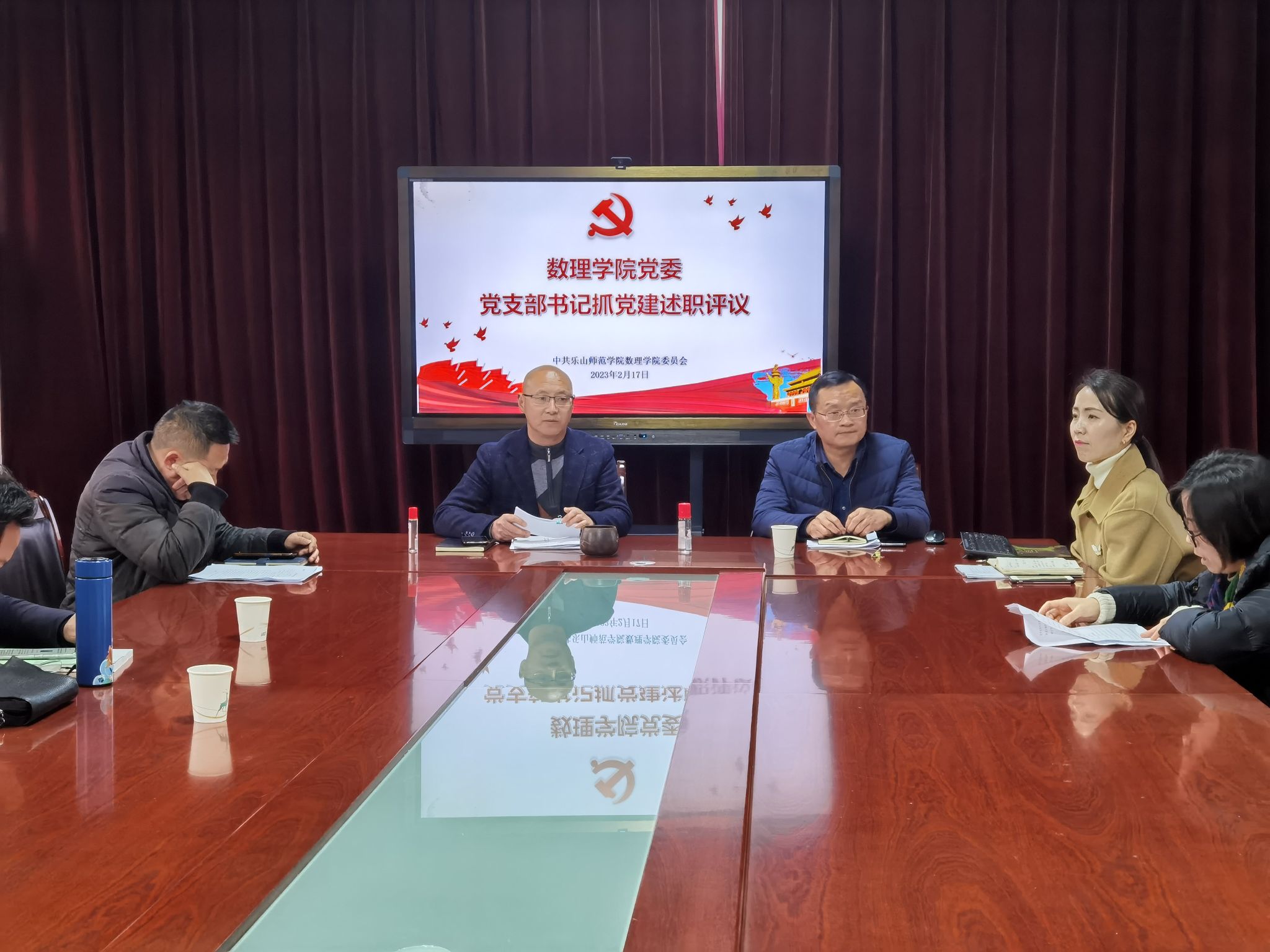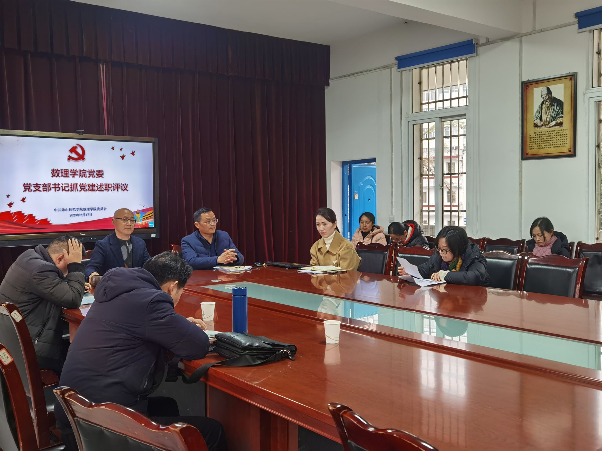 本网讯(文、图/余瑶)2月17日,数理学院党委在博雅楼二楼会议室召开2022年度党支部书记抓党建工作述职评议会。学院党委委员、纪委委员、党支部书记、全体党员参会,会议由学院党委书记马力强主持。