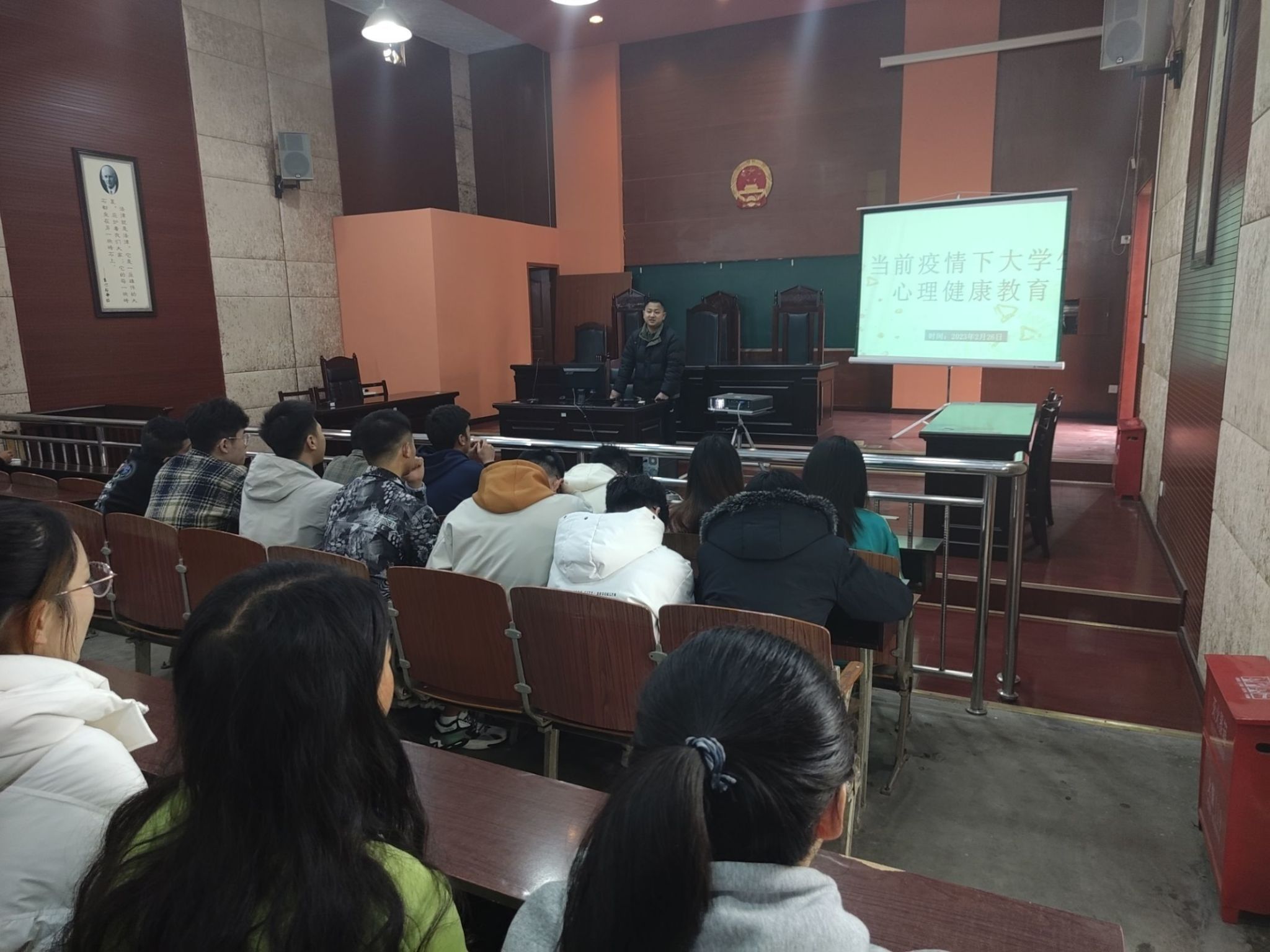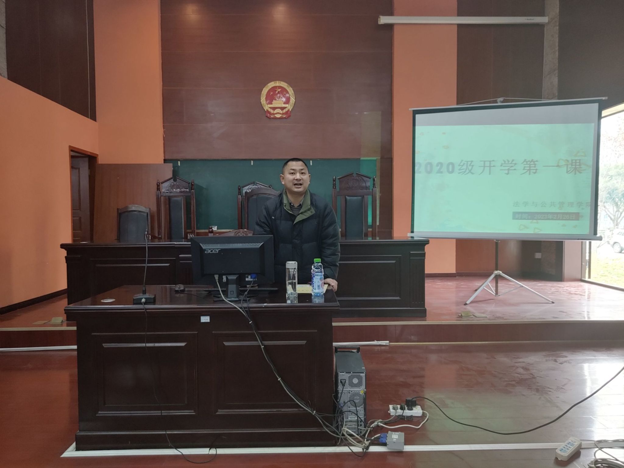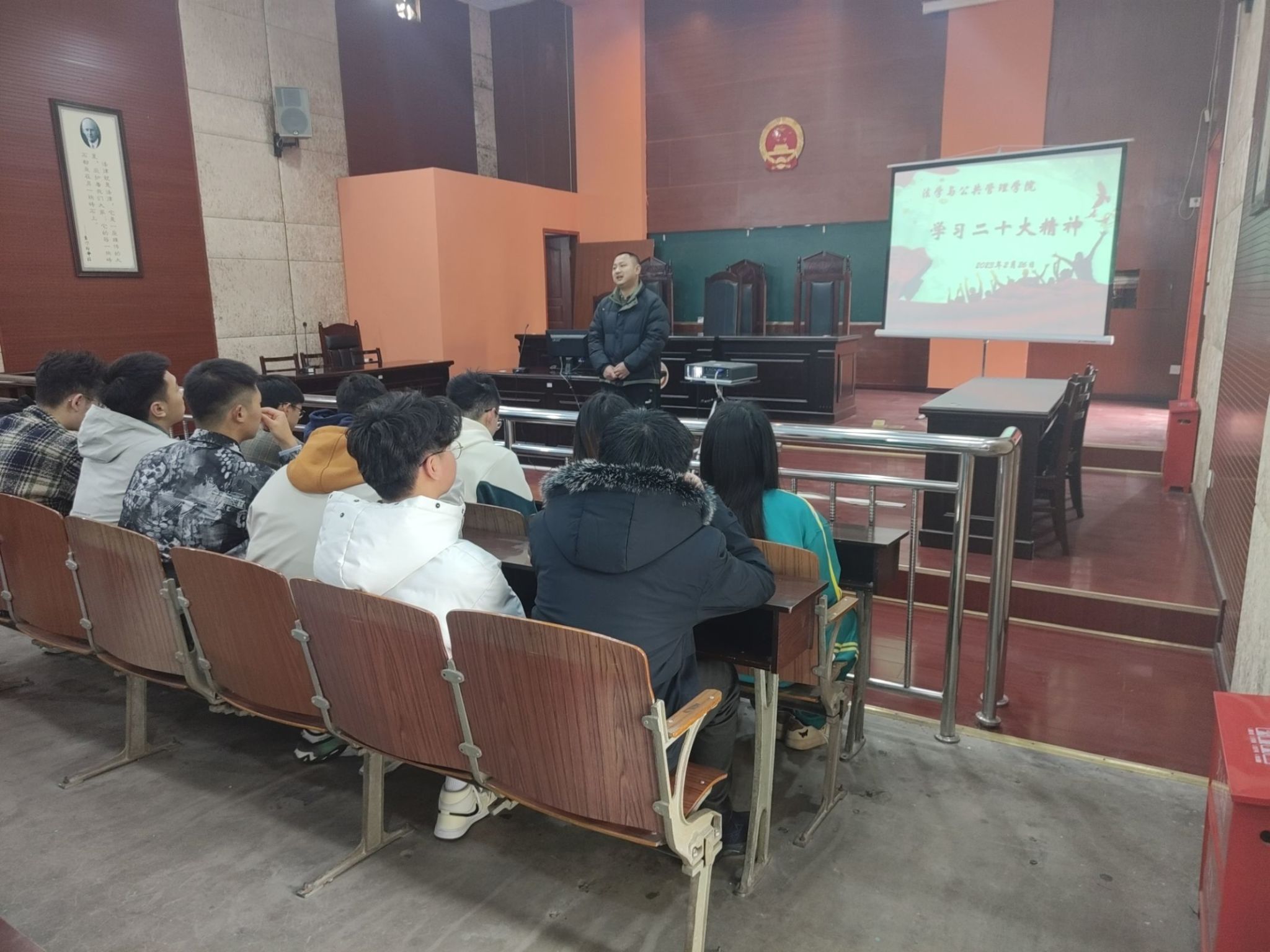本网讯(文/杨兵 图/叶烩)为了让同学们更快地适应新学期,开始新征程。法学与公共管理学院各年级分别于2023年2月26日-3月2日,在博雅楼模拟法庭等教室开展了“开学第一课”活动,各年级辅导员及全院学生参加了本次活动。