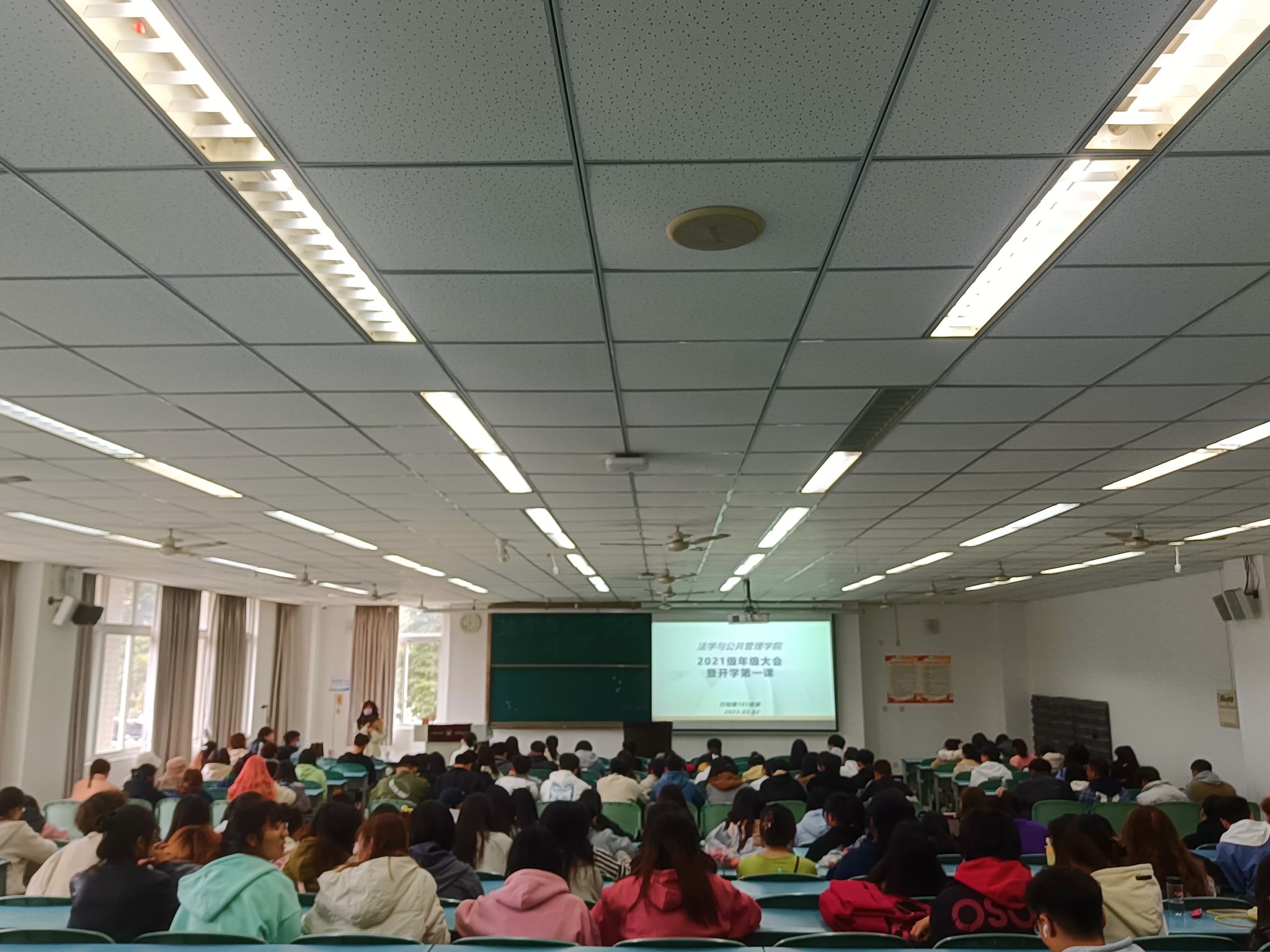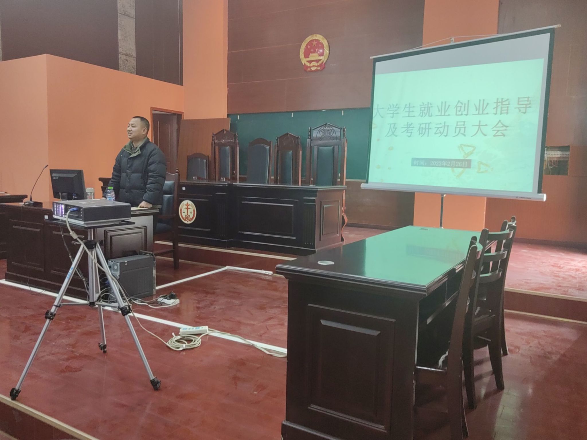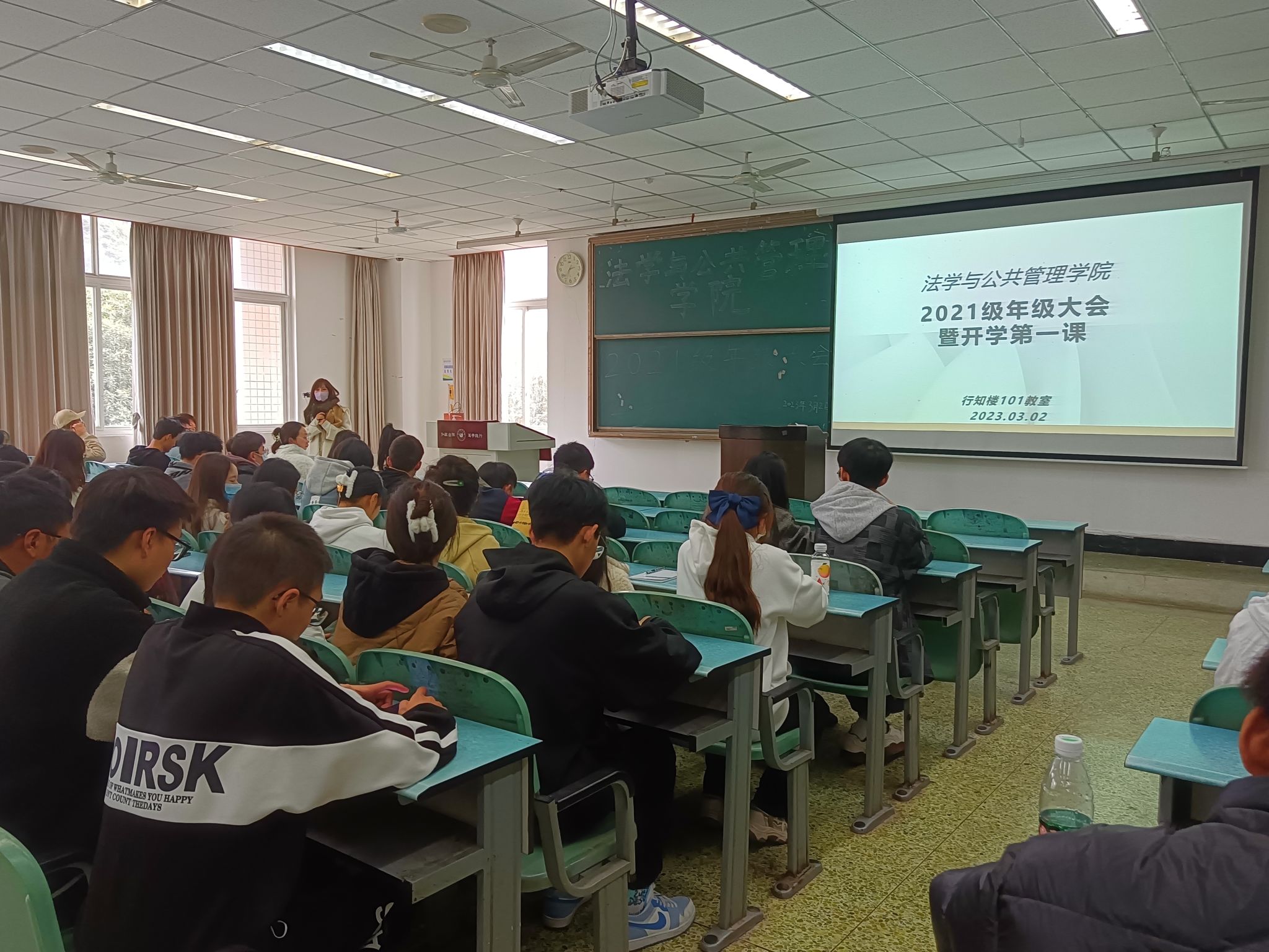 本网讯(文/杨兵 图/叶烩)为了让同学们更快地适应新学期,开始新征程。法学与公共管理学院各年级分别于2023年2月26日-3月2日,在博雅楼模拟法庭等教室开展了“开学第一课”活动,各年级辅导员及全院学生参加了本次活动。