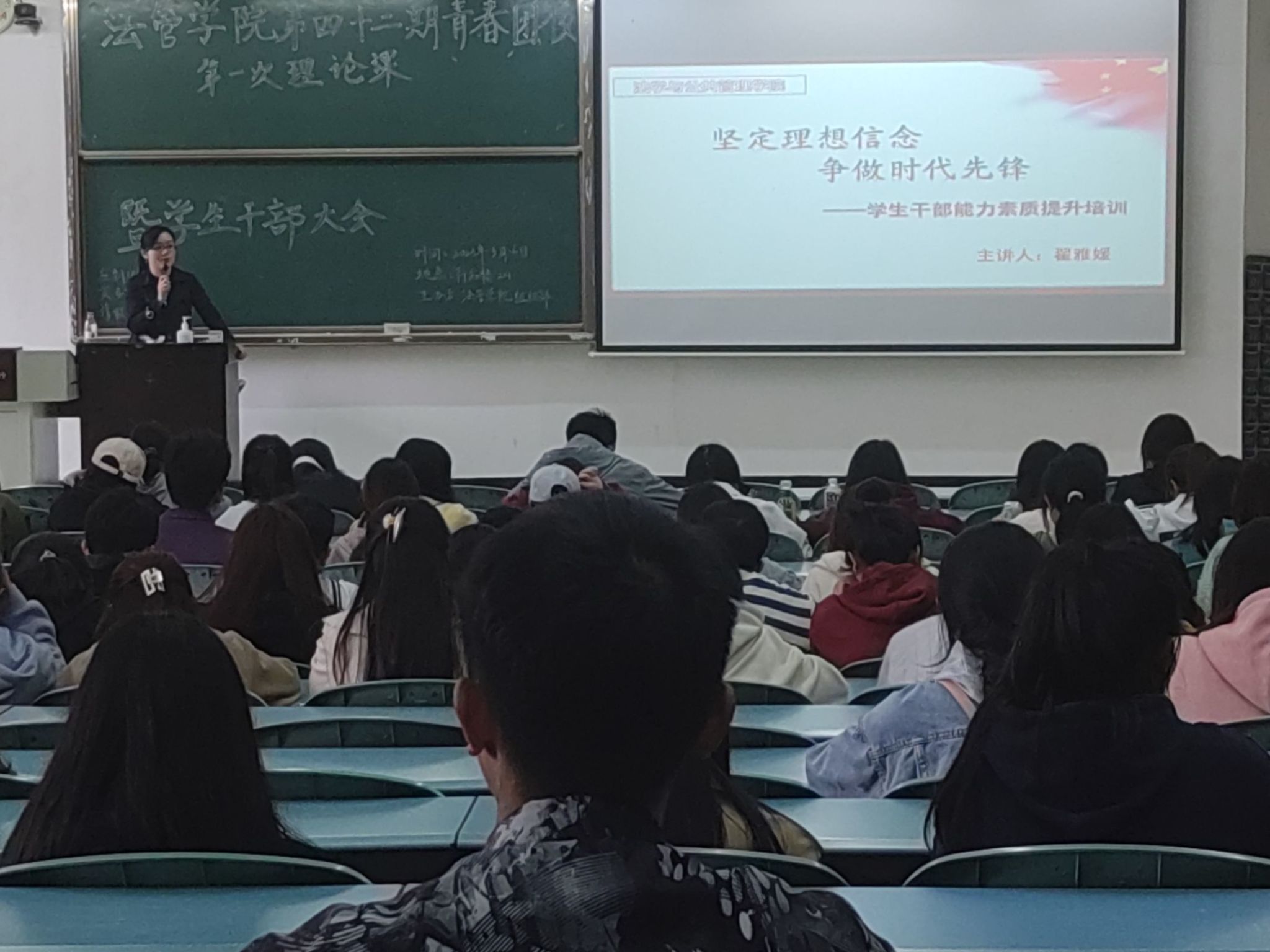 本网讯(文、图/曾付艳)为深入贯彻落实习近平总书记对学习雷锋精神的重要指示,以雷锋精神引领广大团员青年厚植爱党爱国情感,法学与公共管理学院于3月16日下午3点在行知楼201教室举行了第42期青春团校第一次理论课暨学生干部能力素质提升培训会,学院党委副书记、纪委书记翟雅媛担任主讲人,第42期青春团校全体学员参与学习。