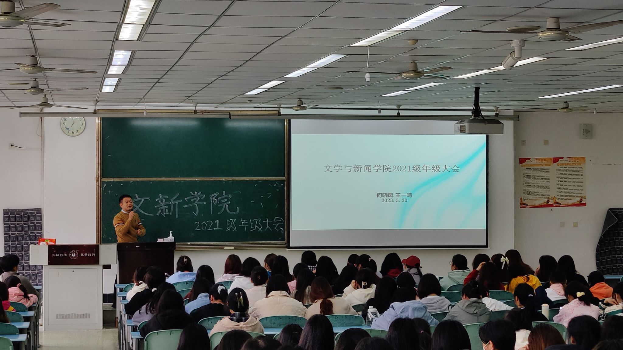 本网讯(文、图/范龙雨)近日,文新学院2021级在行知楼125教室里举行年级大会暨学风整顿大会。文新学院学生科科长、21级辅导员王一鸣,专任老师何晓凤、张羽,21级全体学生和部分高年级学生代表参加。