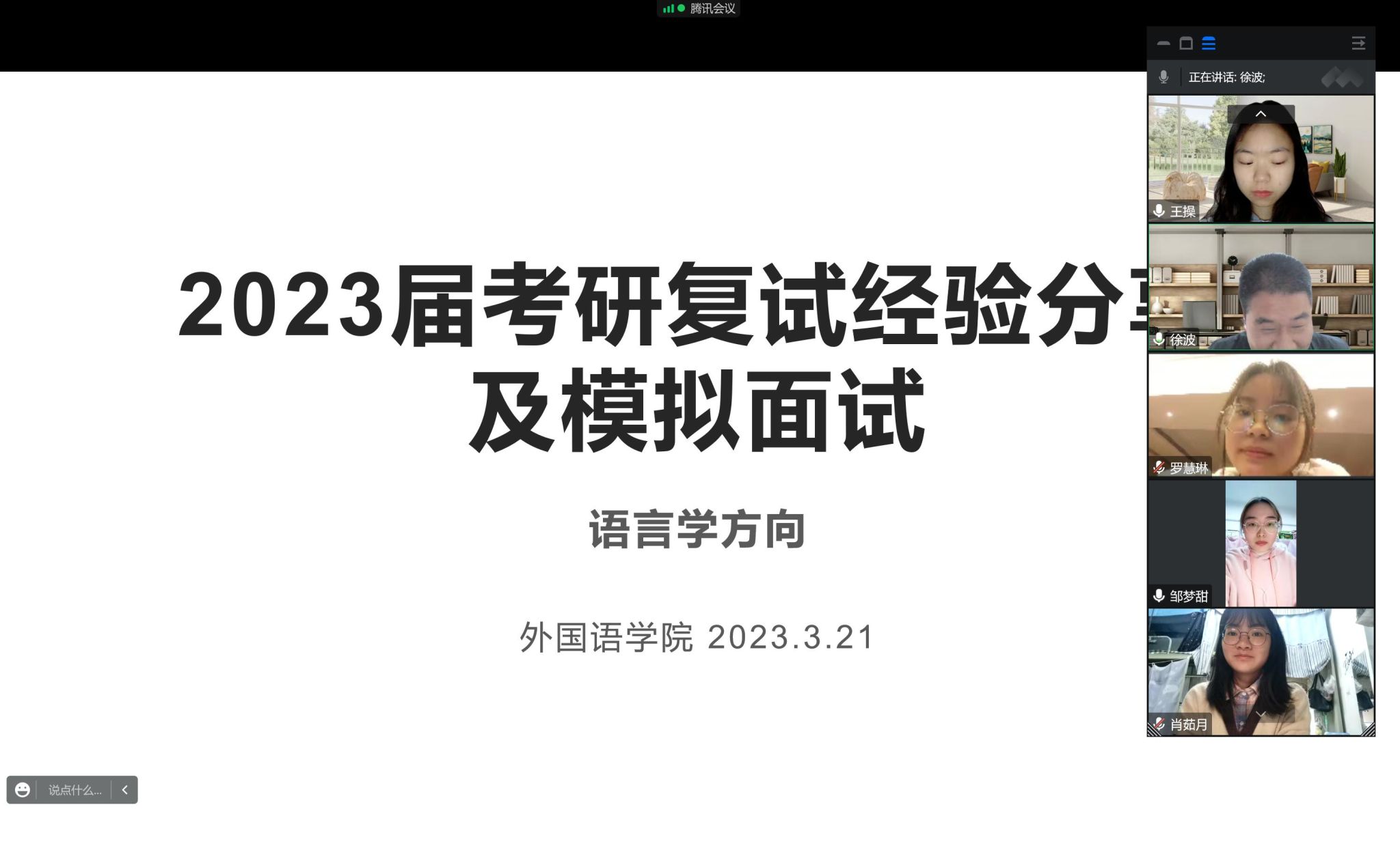 本网讯(文图/王柯芦)3月21日晚,外国语学院语言学团队教师徐波、王柯芦对2023年已上国家线4位同学,进行了考研复试线上指导和模拟面试。