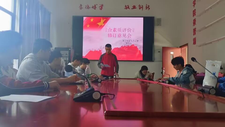 本网讯(文/张智诚 图/黄泽静)3月31日中午,电子信息与人工智能学院召开关于学生综合素质评价表修订意见会议,参会人员有辅导员强光平、雷雄锴、肖苗,相关部门干部以及学院各班级素拓委员。