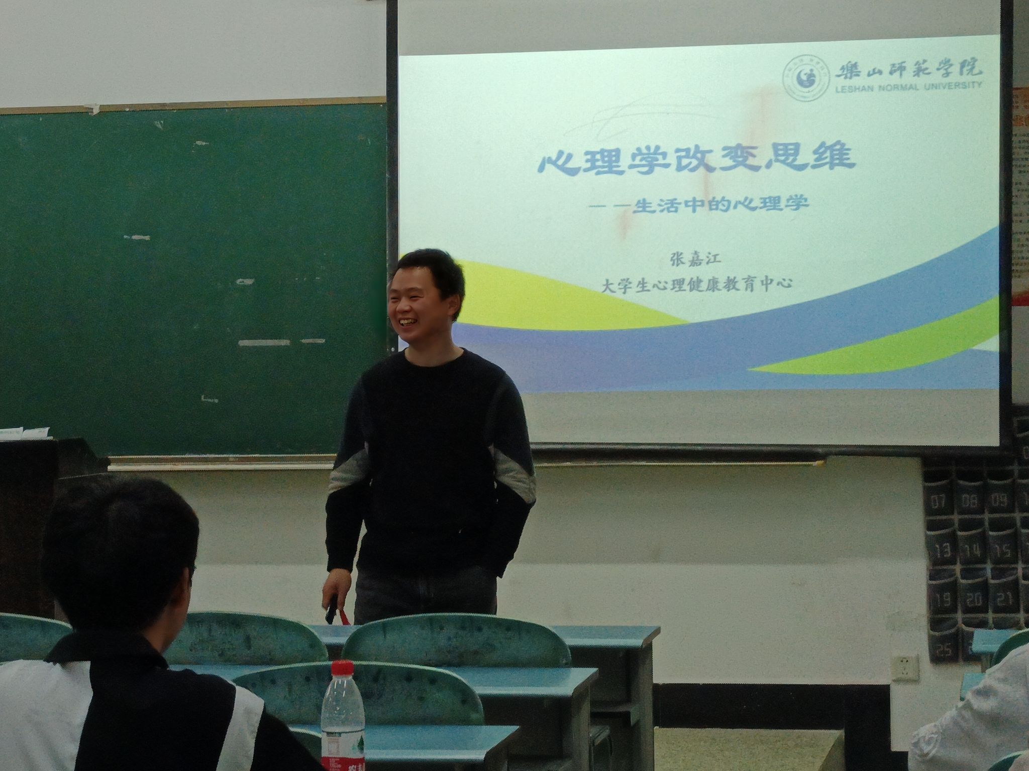 本网讯(文图/欧洁)为帮助大学生们答疑解惑、驱散心中阴霾,培养正向思维、善良与爱、人际智力等,提升追寻幸福的能力,4月3日晚上7点,党委学生工作部心理健康教育中心兼职心理教师张嘉江,在行知楼209开展了主题为“心理学改变思维——生活中的心理学”阳光心灵大讲堂。本次讲堂为今年3·25-5·25心理健康教育宣传月系列活动之一。
