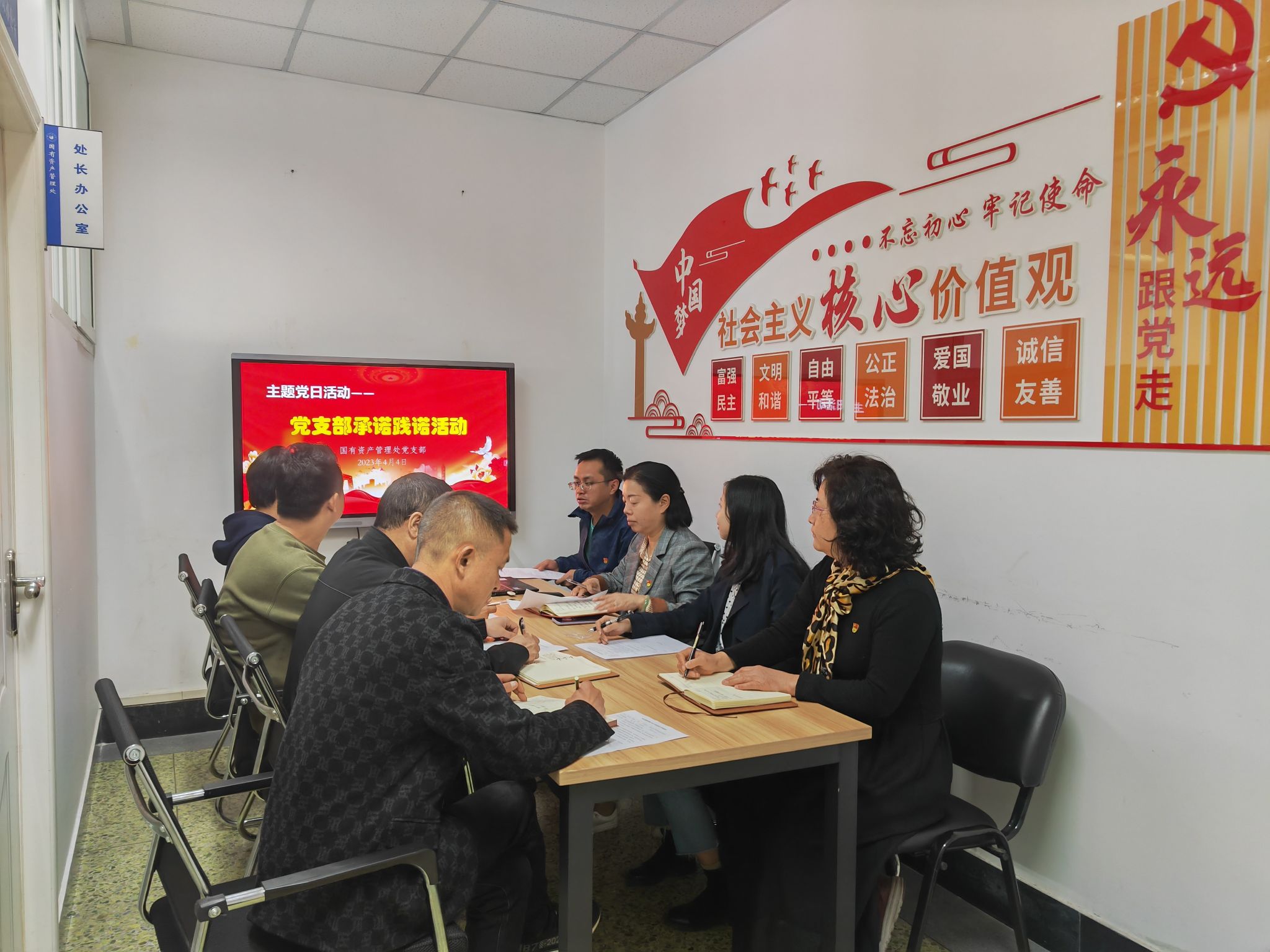 本网讯(文、图/许桦)为深入学习贯彻习近平新时代中国特色社会主义思想,充分发挥党支部的战斗堡垒作用和党员的先锋模范作用,根据《中共世界杯葡萄牙vs加纳波胆预测 委员会建立党组织和党员承诺践诺、群众评诺制度的规定》要求,4月4日上午,国有资产管理处党支部在弘毅楼500室开展了主题党日活动,围绕卡塔尔世界杯决赛波胆预测 要点工作、部门重要工作和党建工作提出庄重承诺。本次活动由支部书记舒勇主持。