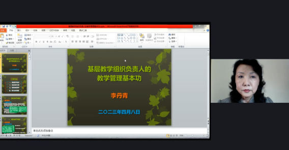(文/汪科、图/王振洲)为贯彻落实党的二十大精神,特殊教育学院以学思践悟党的教育方针为主线,以新时代应用型人才培养和教育发展为主题,发挥基层教学组织负责人在专业建设和人才培养工作中的组织和引领作用,持续推动学院基层教学组织高质量运行。4月7日-9日,特教学院组织各专业负责人及教研室主任参加了由北京教发方略教育科技院举办的题为“2023 高校专业负责人和基层教学组织负责人岗位职责核心能力提升实务培训班”的线上专题培训。