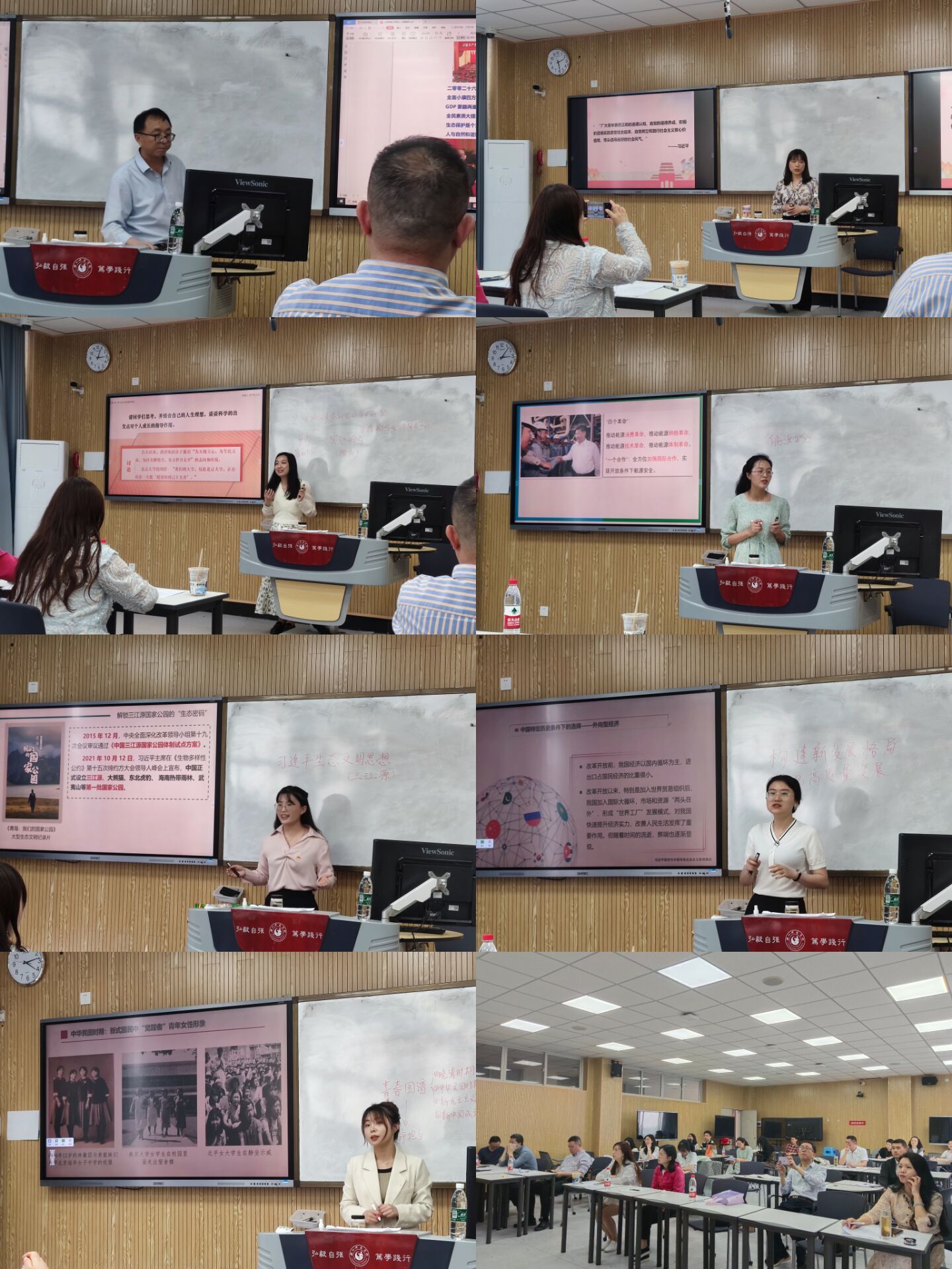 比赛场上,蒋华志运用歌唱、快板、诗歌等形式讲出了别有风味的思政课。周柯利以案例导入,层层分析社会道德问题,揭示道德的功能效用,思路清晰逻辑严谨。刘馨宇从理论上解析了何谓马克思的科学预见性。张伟荣从国际能源问题出发,全面讲解当前世界能源安全及我国应对。张艳沁运用“云”思维,带领大家走进三江源国家公园,体会习近平生态文明思想的科学内涵和时代价值。雍滨瑜从我国改革开放以来的实践切入,阐释构建新发展格局的时代背景和战略意义。胥俐君按照近代以来的时间主线,展现了一幅我国女性地位变化的历史画卷。七位老师准备充分,在教学中灵活运用板书、道具、互动、案例等,呈现出了各具特色的教学风采风格。