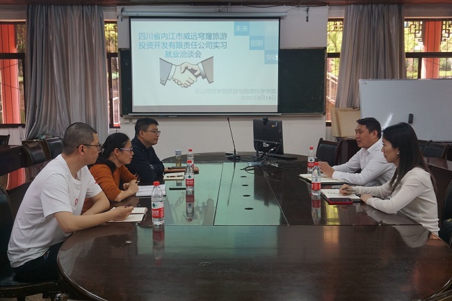 本网讯(文/江馨雨 图/张雯)近日,旅游与地理科学院邀请四川省内江市威远穹窿旅游投资开发有限责任公司到学院实验楼102教室开展了实习就业洽谈。学院院长郭剑英、副院长孙永兴、2020级辅导员孟凡帅老师以及该公司执行董事兼经理郭飞、综合管理部部长王一璠参加了此次洽谈会。