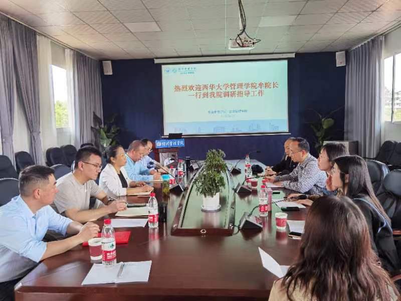 邓健代表学院欢迎牟绍波一行莅临指导,对西华大学管理学院长期以来对学院的关心、支持表示感谢。双方就学科建设、专业建设、课程建设、人才培养、申请硕士点、学生考研、就业等工作进行了交流研讨,牟院长一行对我们学院的人才培养理念和就业方面取得的经验给予高度肯定,针对我院的学科建设特别是硕士点建设方向凝练、校外兼职硕士生导师合作事项、学生考研生源基地建设、人才培养方案修订、实验室建设和非学历职业技能培训等方面提出了很好的建议。