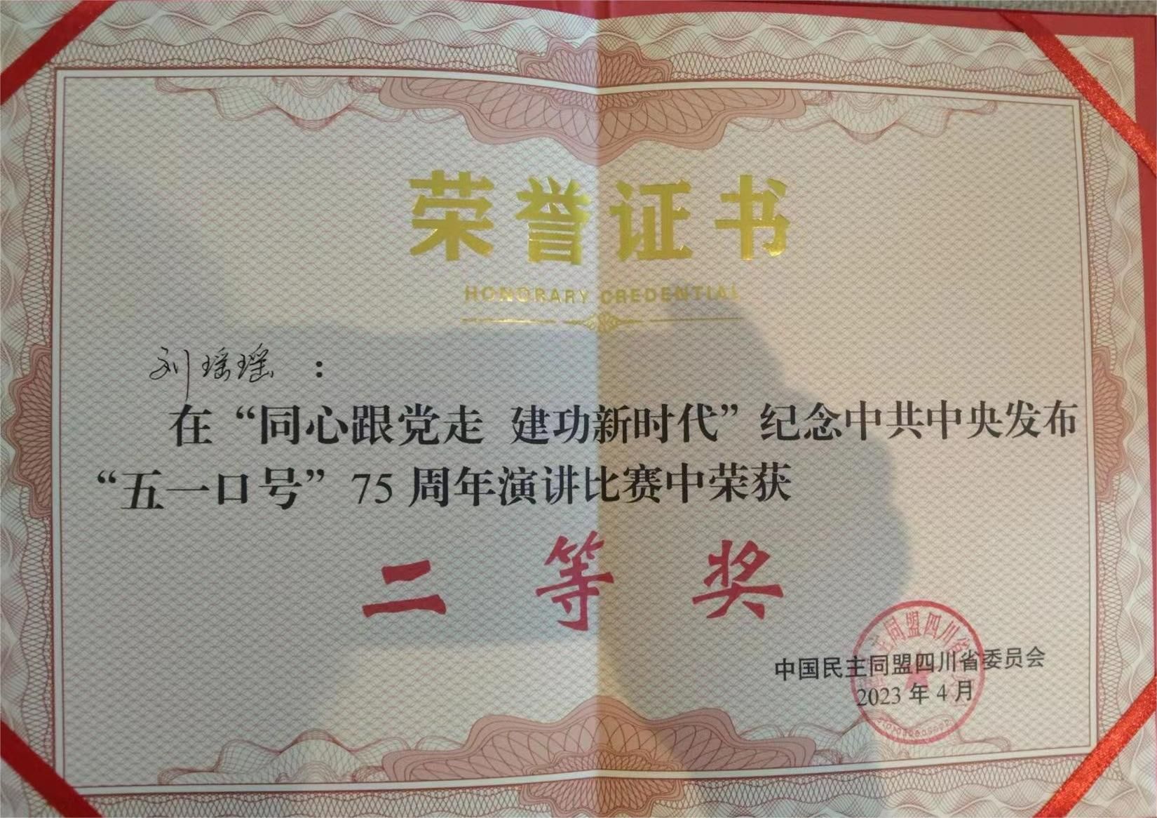 我校民盟总支主委刘瑶瑶以《勇担使命,不负韶华,凝心聚力共襄民族复兴伟业》为题,通过一个个鲜活事例、一幕幕动人场景,从历史与现实、理论与实践相结合的角度,重温了“五一口号”发布75周年走过的光辉历程和多党合作事业取得的伟大成就,展现了新时代民盟盟员“矢志不渝跟党走,携手奋进新时代”的坚定信念。最终经过激烈的角逐,刘瑶瑶代表民盟乐山市委荣获此次比赛的二等奖。