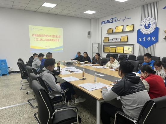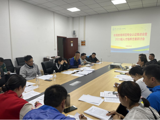 本网讯(文/图 冉圣男)为进一步推进体育教育师范专业认证工作,研讨2023版人才培养方案修订方案,5月10日晚在体育学院会议室召开了体育教育师范专业认证推进会暨2023版人才培养方案研讨会,学院副院长黄河、体育教育专业负责人鲁长春及各教研室主任和相关任课教师参加了会议,会议由鲁长春主持。