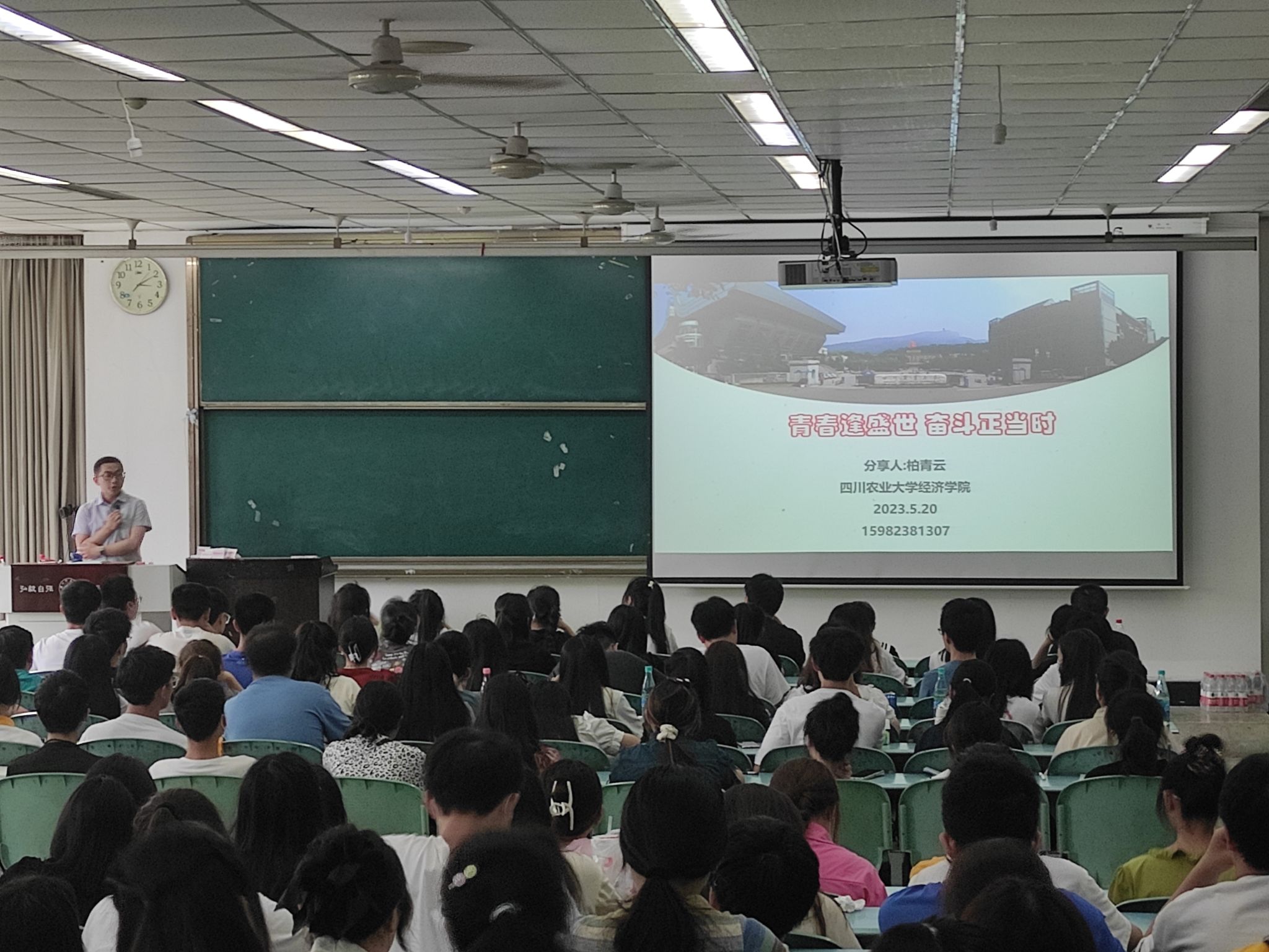 本网讯(文图/曾涵)5月20日下午15点,数理学院邀请到四川农业大学经济学院博士柏青云在行知楼101教室开展“青春逢盛世,奋斗正当时”专题讲座。讲座由数理学院副院长孙海主持,数理学院2022级270余名同学参加。