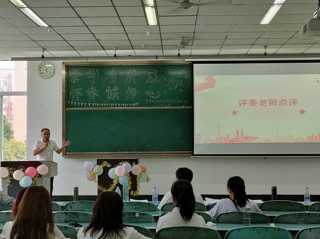 最后,由舒建新老师和毛加宁教授上台进行点评。舒建新老师从参赛选手的状态、板书、说课内容等方面进行了点评,并建议大家多学习优秀老师的教学方法。毛加宁教授强调了参赛选手精气神的重要性、书本内容的精简性和说课讲课的规范性。
