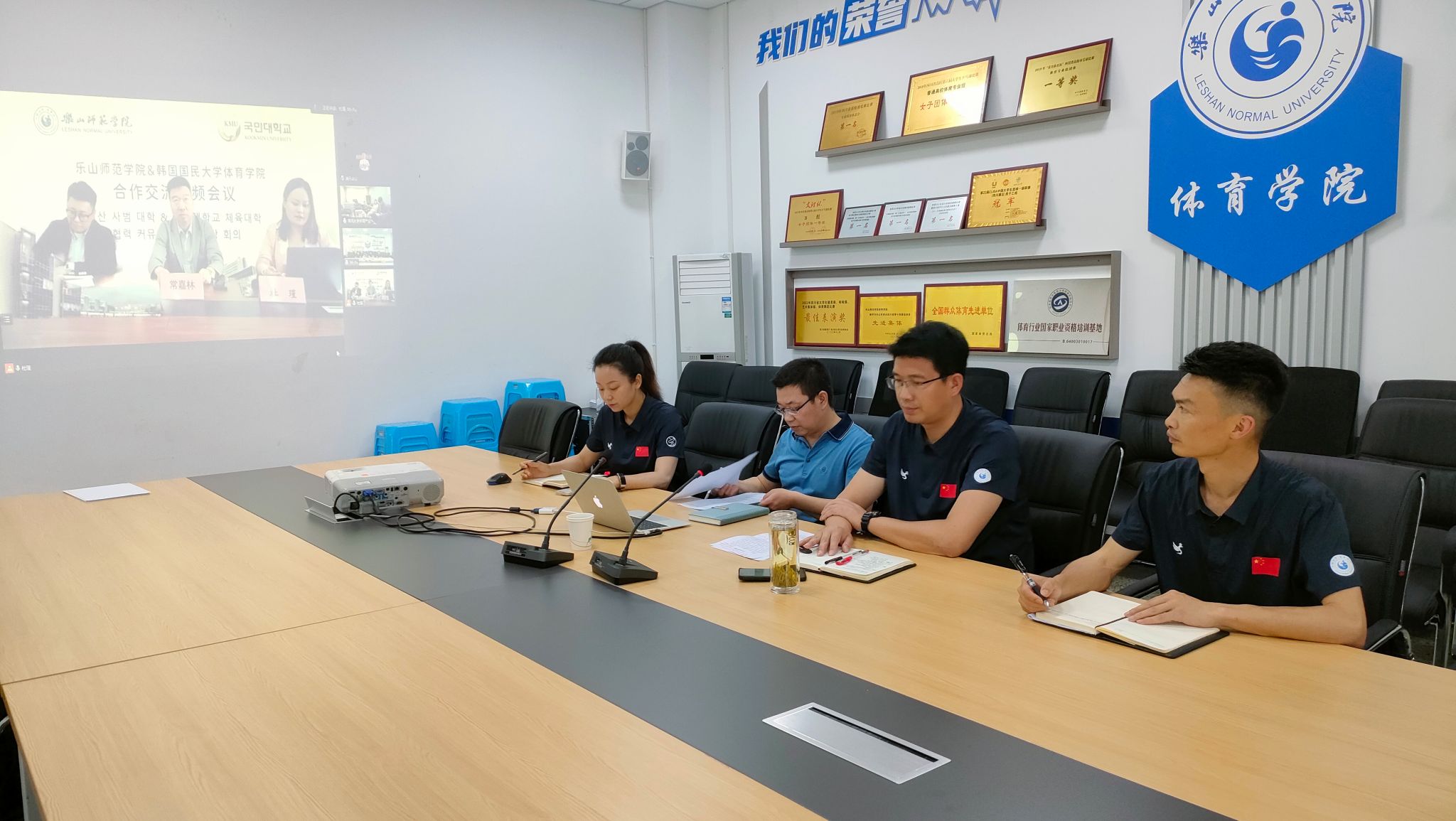 本网讯(文、图/关光富)5月18日上午,我校体育学院与韩国国民大学体育学院在体育学院305会议室召开在线合作研讨会。我校体育学院党委书记钟大勇、副院长黄河、学生管理科科长关光富,韩国国民大学体育学院副院长曹星、韩国国民大学体育学院中国办公室国际交流处主任常嘉林参加研讨会。会议由国际合作与交流处副处长蒲仕江主持。