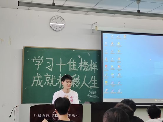 随后进入主题,以ppt和短视频的方式对白奉国等“十佳青年”的经历进行具体介绍。让同学们对“十佳青年”们的奋斗事迹,各项荣誉,如何克服困难的过程有了全方面的认识。同时让同学们知道“十佳青年”是通过不断的砥砺奋进,拼搏向前得来的。当白奉国站在讲台上,学习“榜样”不再是抽象的词,而是同学们努力追赶的对象。