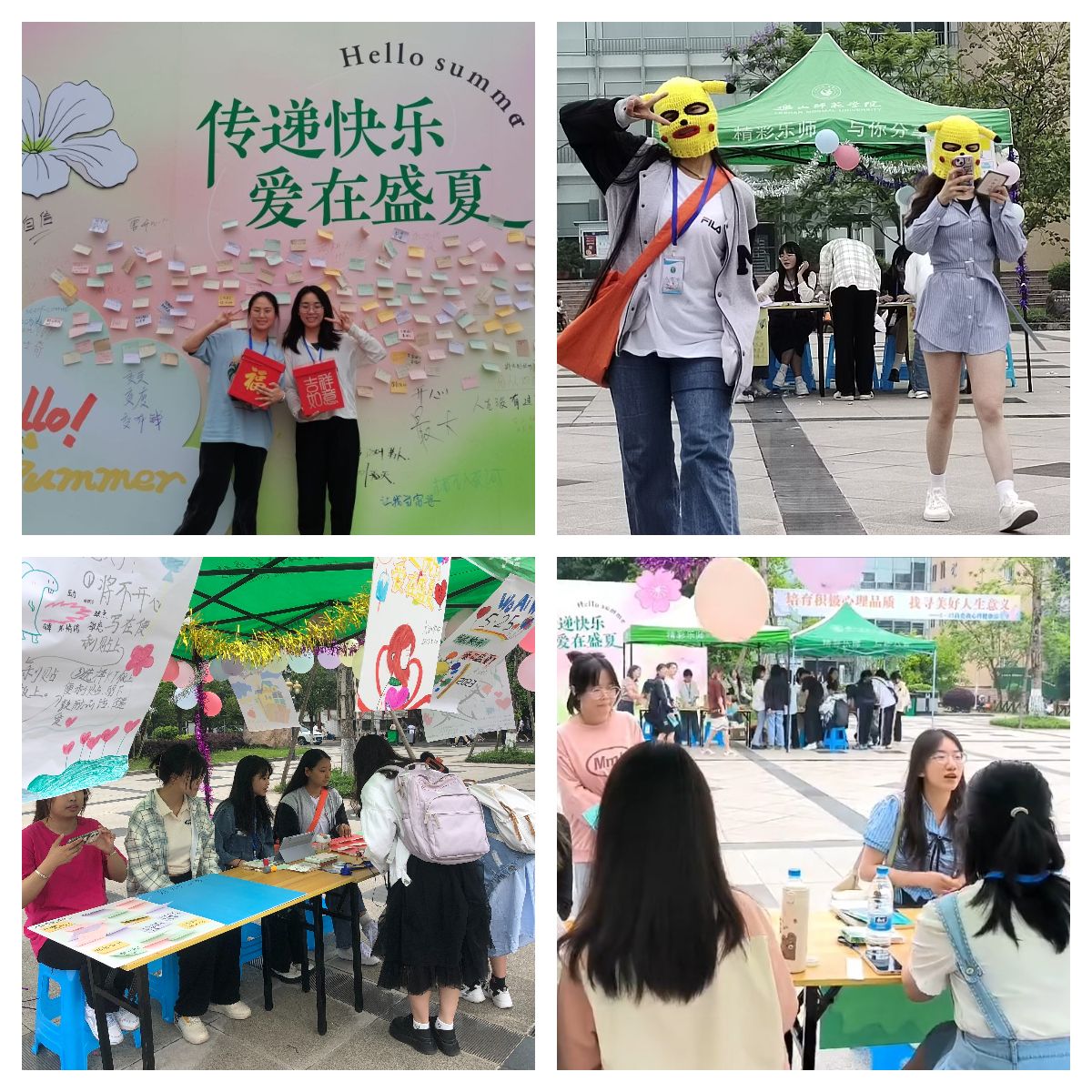 在桂花广场,朋辈心理辅导员、心理委员、心理卫生社成员、学生会分团委等,以“立德引心、启智润心、强体健心、美育暖心、劳育炼心”为活动载体,开展了“心灵超市—5分钟应对你的小情绪”路演互动体验活动,通过个人访谈、益智游戏、身心锻炼、一人K歌、手工DIY教学、治愈心理漫画展等形式,挖掘构建积极心理品质,充分发挥朋辈引领作用。文学与新闻学院二级心理辅导站以“传递快乐·爱在盛夏”心理游园会,吸引大学生们在表达烦恼、应对情绪等心理游戏体验中,舒缓情绪、传递快乐。数理学院二级心理辅导站通过“爱的抱抱” “烦恼解忧”等活动表达对自我的关怀与悦纳,鼓励大家积极面对生活中的挑战。