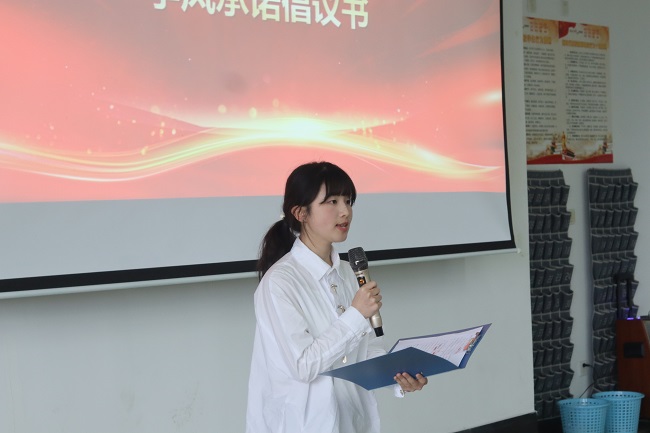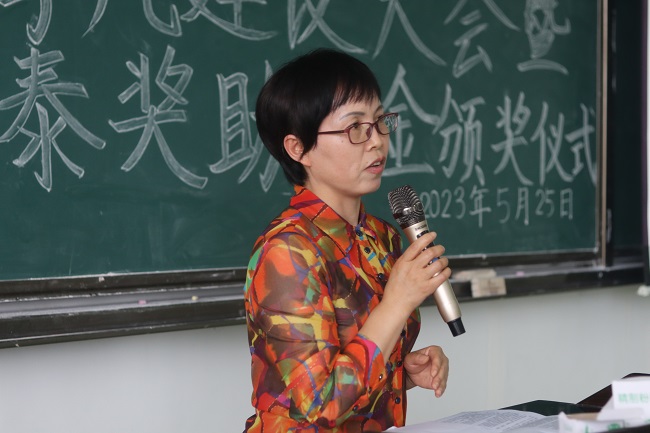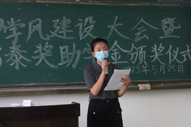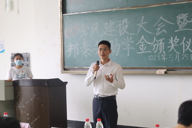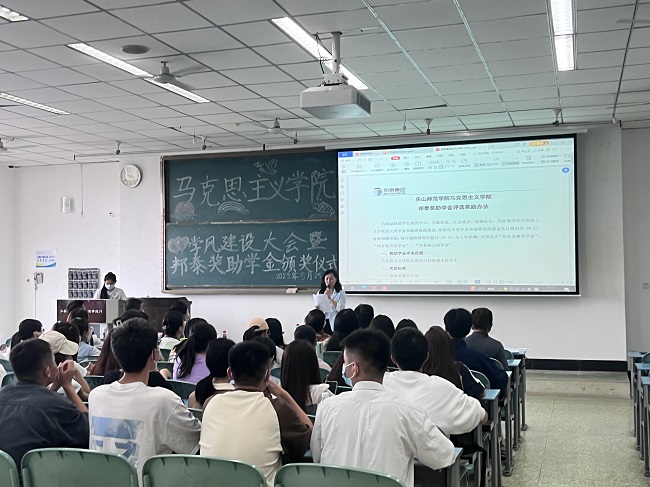 大会上,学院党委书记李涛宣读《马克思主义学院邦泰奖助学金评选奖励办法》,党委副书记钟永淑宣读《邦泰奖助学金表彰决定》。宣读完后,由邦泰集团品牌总监姚婕妤为他们颁奖。颁奖完后,姚婕妤讲话,她以集团建设的发展与变化展开讲述,从面临危机到艰难前行,在她的讲述中,大家感受到邦泰集团的成长与不易。随后,她与受助学生倾情对话,受助学生一方面表达对邦泰集团的感谢,另一方面也表示将继续努力,为祖国的繁荣昌盛贡献自己的绵薄力量。随后,2019级甘八斤发表感言,他表示,此次获得邦泰奖助学金,是学院、老师和自己共同努力的结果,自己也将带着这份爱心将继续传递。接着,钟永淑老师从培根铸魂、理论学习、实践宣讲学习等三个方面宣读了学风建设方案,她强调,要加强三字一话训练、注重英语学习、人人会宣讲等。从文件解读来看,学风建设方案正向着同学们全方位发展逐步完善。希望同学们在培养方案的助力下,茁壮成长,向优秀看齐,向未来进发!钟永淑老师的话语重心长,对在座同学成长成才具有重要的指导意义。随后,学生代表樊子燚发出学风承诺倡议书,在场同学积极响应倡议,坚定、诚恳地做出了自己的承诺。随着一声声颁奖音乐的响起,走上领奖台的同学们精神饱满,热情洋溢,展示出了新时代青年积极向上的风貌。最后一项议程,在观看优秀学生葛馨月的成长视频,现场聆听付玲欣的分享后,同学们纷纷表示,将向榜样看齐,向榜样学习,争取在未来取得更好的成绩。