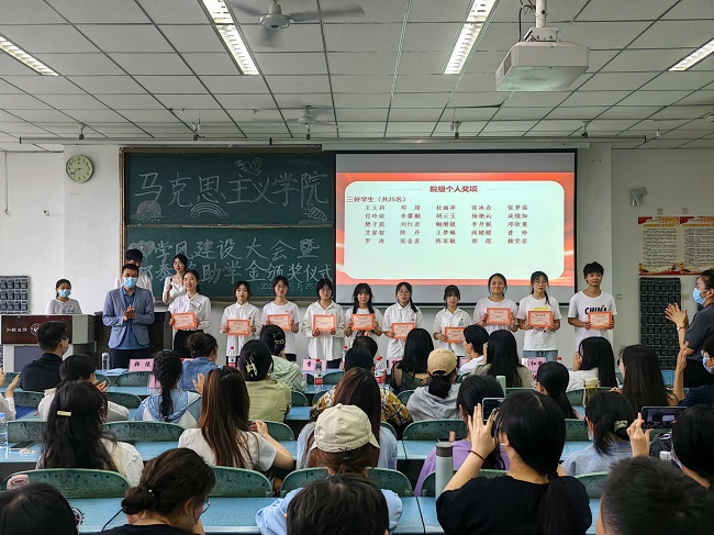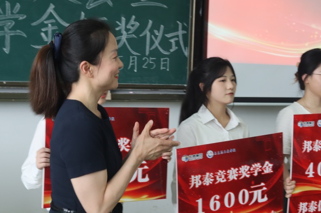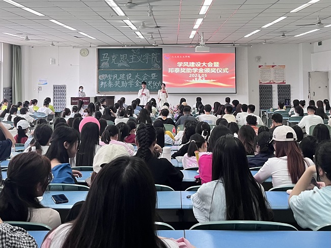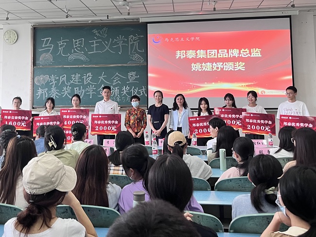 本网讯(文/黄潇亿 图/罗雅欣 包玲)敢为人先,成才不负青云志。继往开来,报国常怀赤子心。5月25日,马克思主义学院在行知楼425教室隆重召开学风建设大会暨邦泰奖助学金颁奖仪式。本次大会邀请到邦泰集团品牌总监姚婕妤出席。学院党委书记李涛、副书记钟永淑、辅导员、各班班主任出席,获奖集体、学生代表等200余人参加。