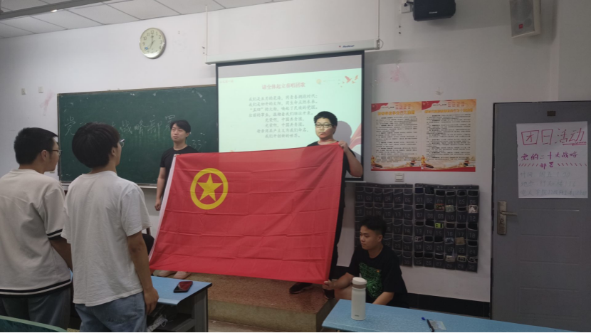 活动前,各团支部提前做好准备。活动开始,各班团支书主持活动进行,活动开始,全体肃立,迎团旗,齐唱团歌《光荣啊,中国共青团》。随后,主持人介绍本次活动主题及目的,组织学习并讨论党的二十大精神,大家热烈讨论,关于理想与担当,大家纷纷发表自己的见解。最后各团支部重温入团誓词,团支书总结此次活动。