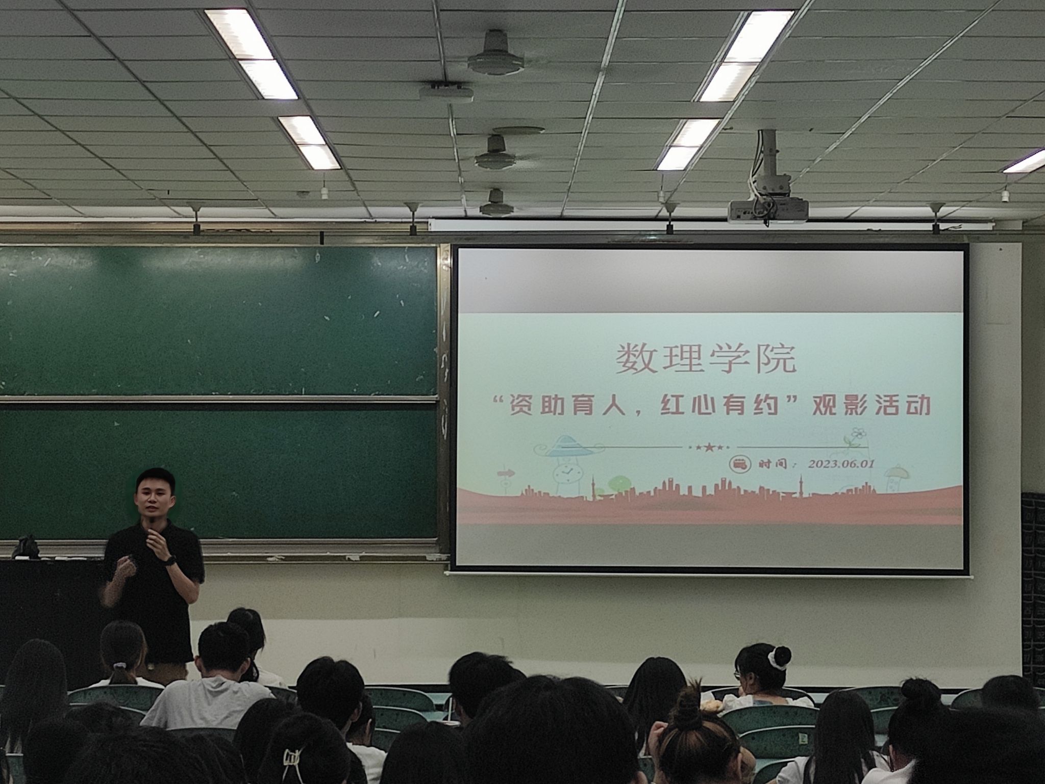 本网讯(文图/杜佳兴)为进一步宣传落实国家资助政策,营造良好的资助育人氛围,6月1日晚上,数理学院在行知楼201教室组织家庭经济困难学生开展了资助育人“红心有约”观影活动。2020级辅导员廖宇及140余名家庭经济困难学生观看电影《老师好》。