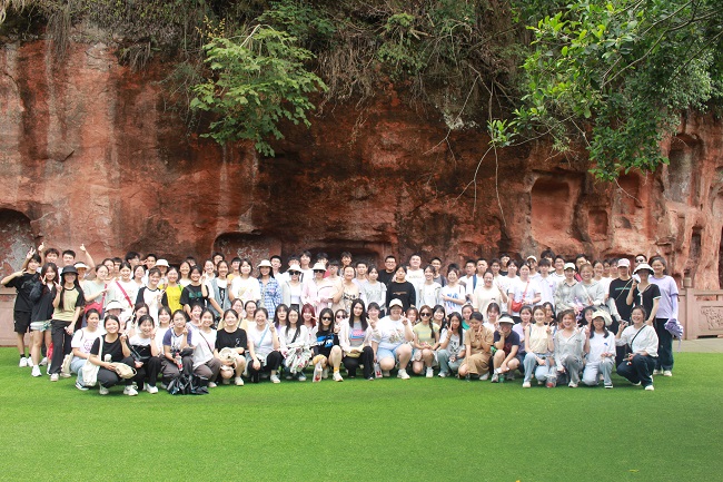 凌云山位于岷江、青衣江、大渡河三江汇合之处,是四川盆地丹霞地貌最具代表性的地方之一,对于地理科学专业实践有着重要意义。同学们从山脚开始,拾级而上,一路研游,在老师的指导下,实地研究丹霞地貌涉及到的地层系统、造景岩石、地质构造、通达性、气候、地貌类型、地貌形态特征等内容,结合凌云山丹霞地貌成因、岩石类型、“三江”水文地貌特征、生物多样性等特点加深了对专业课中所学到的“风蚀雅丹、流水丹霞”、丹霞-卡斯特交集特殊地貌等知识点的认识。除了学习地理方面的知识,同学们也对凌云山的人文知识进行学习。