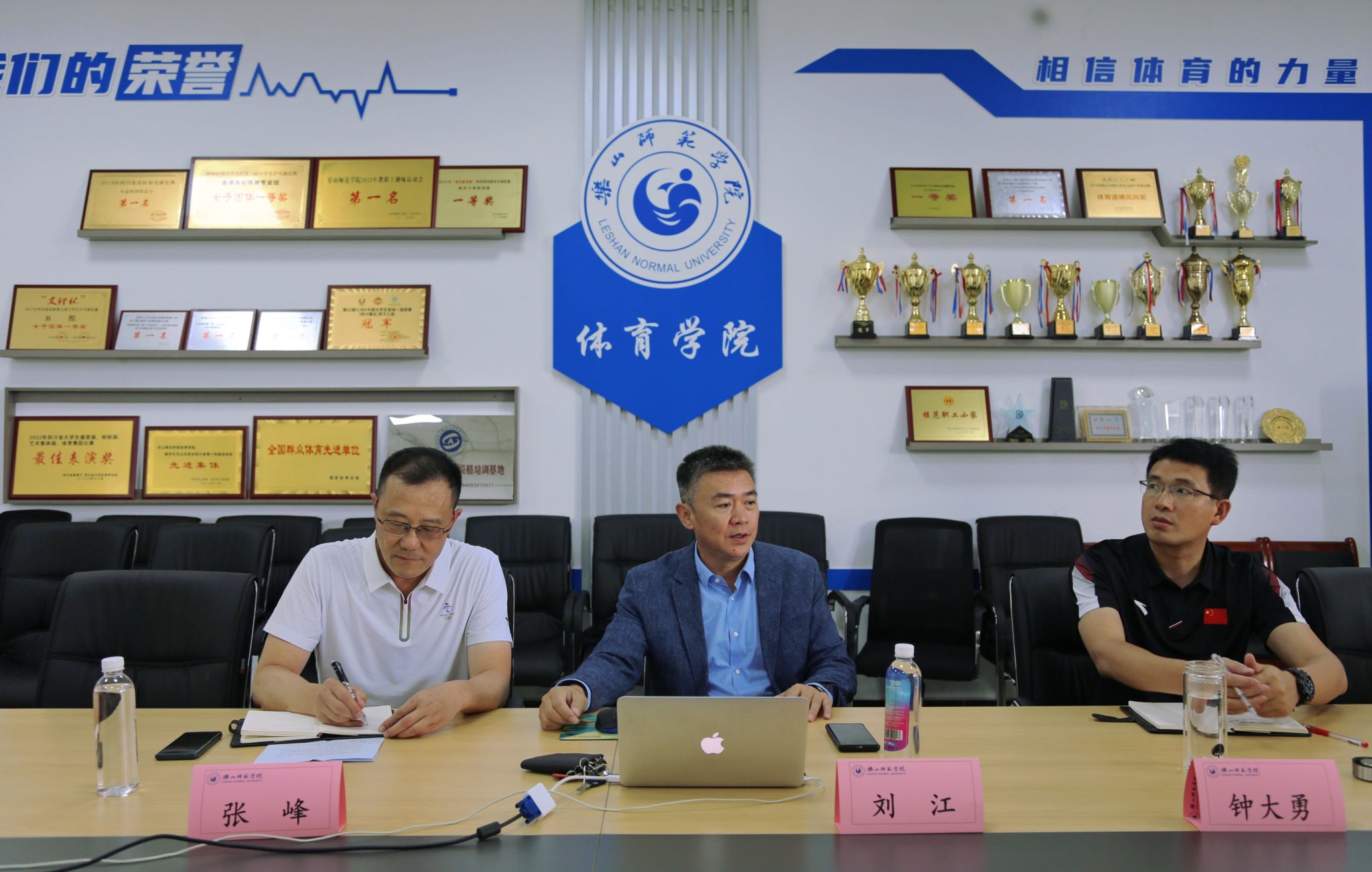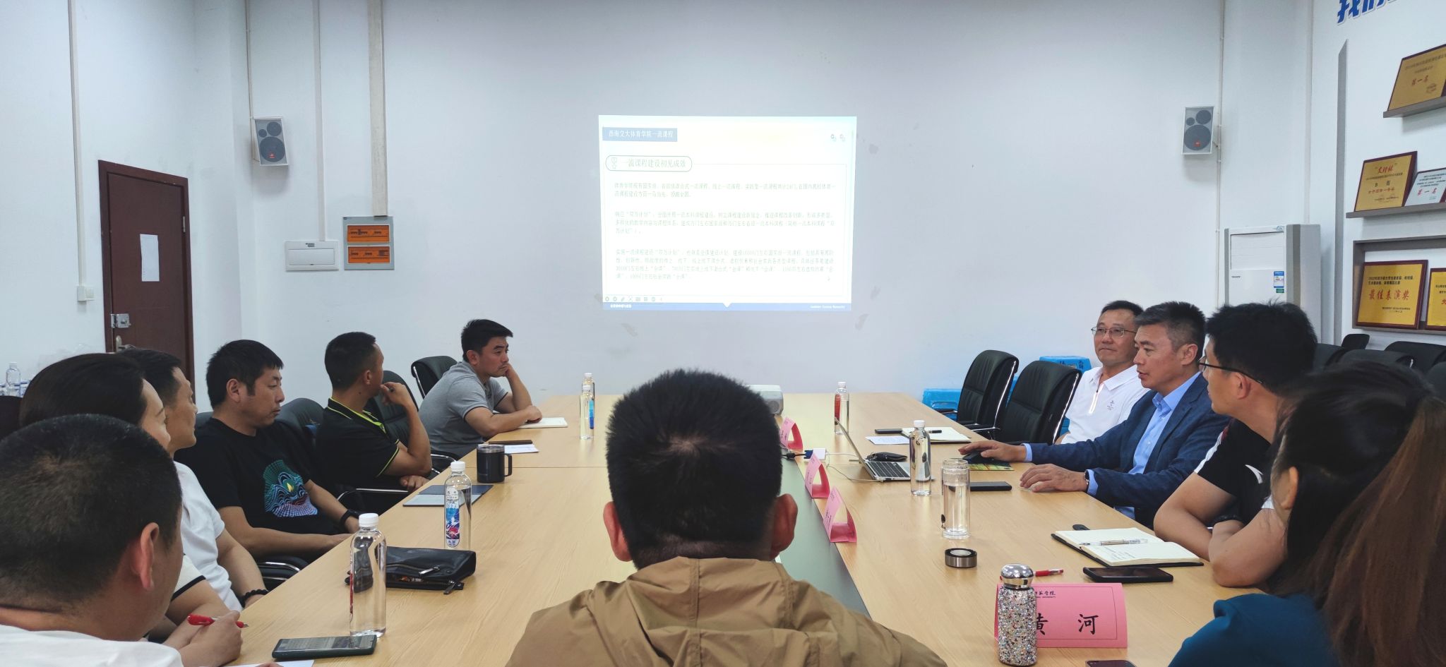 本网讯(文/刘秋 图/裴庚)为进一步加强国家级一流课程建设工作,引导老师明确目标和方向,进一步做好国家级一流课程申报成功率,体育学院邀请西南交通大学体育学院院长,教育学博士,教授,研究生导师,四川省大学生协会秘书长、四川省体育教指委副主任刘江到体育学院给老师们开展国家级一流课程申报和建设讲座。讲座于6月5日13:30在体育学院会议室举行,由体育学院院长张峰主持。体育学院党委书记钟大勇、副院长张爱平、副院长黄河、三个专业负责人、教研室主任以及专任教师30余人参加了讲座。