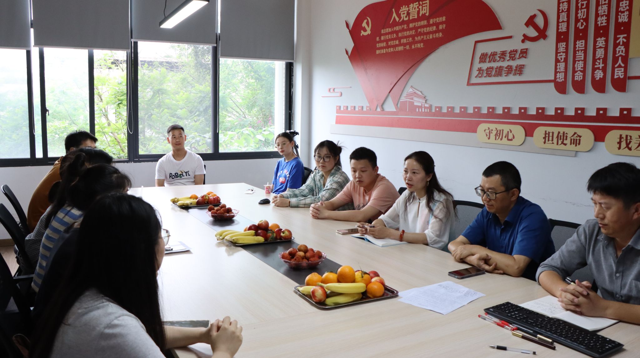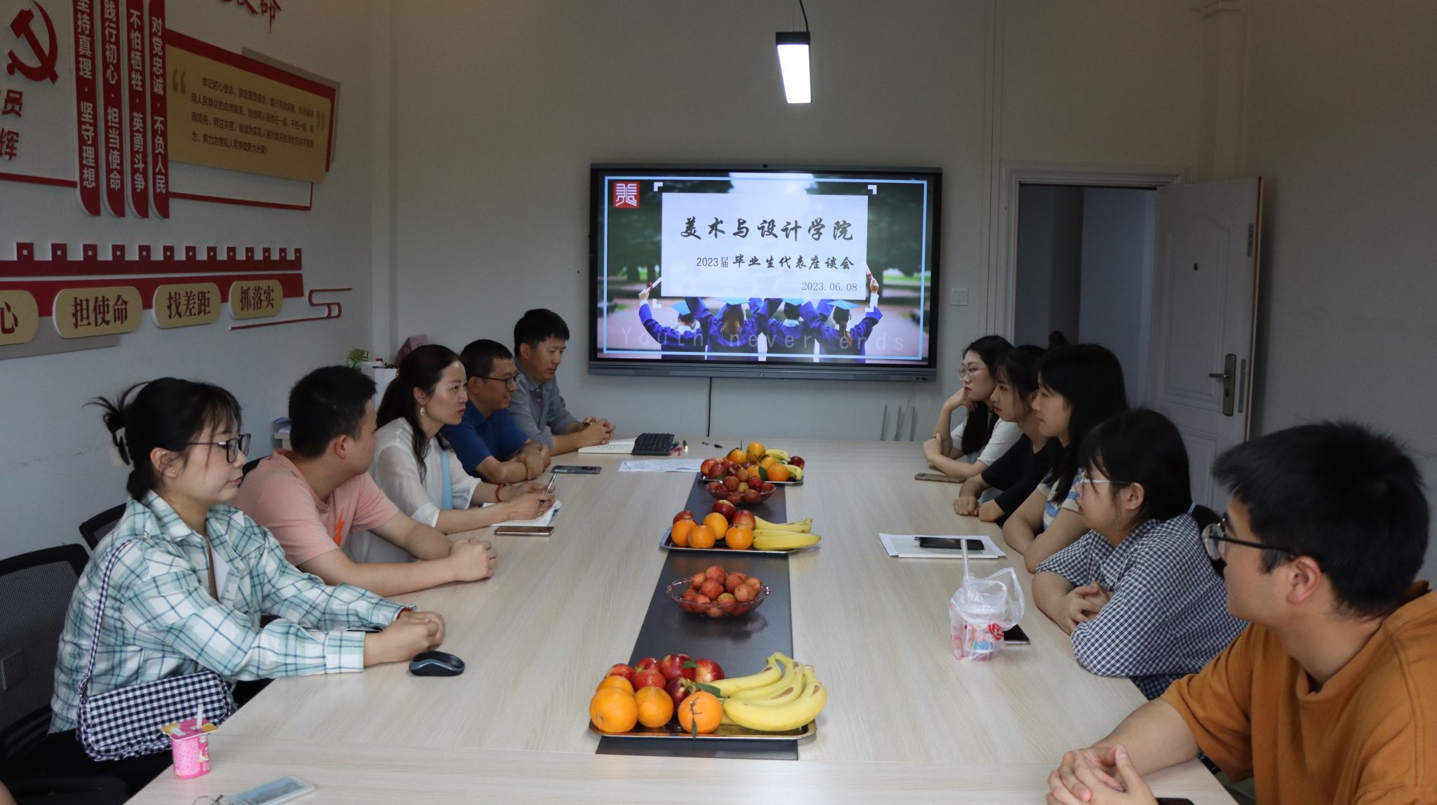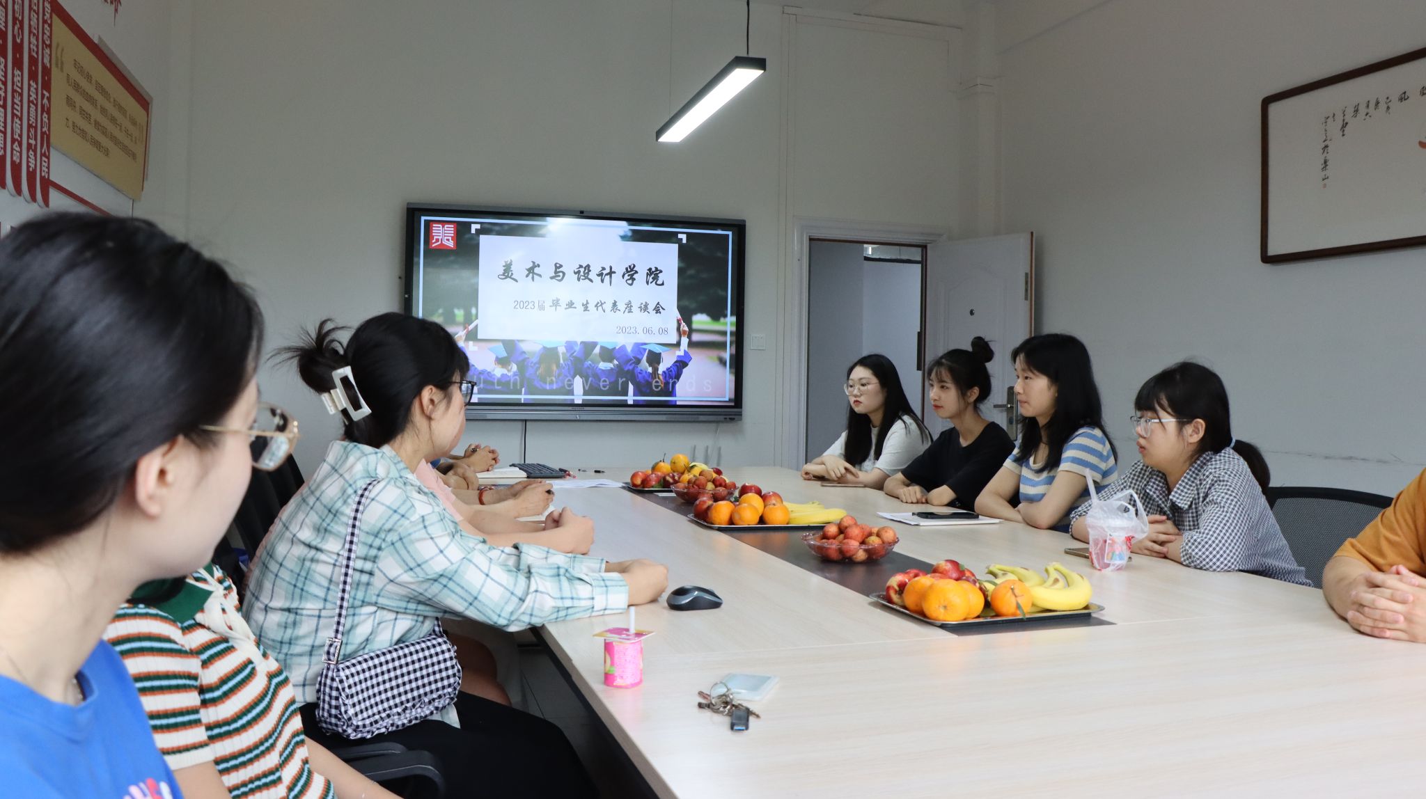 本网讯(文、图/任自林)6月8日上午,美术与设计学院在旷怡楼302召开2023届毕业生代表座谈会,学院党委书记杨虹、党委副书记王孝琴、副院长门涛、教务科科长刘建刚和辅导员任自林出席了座谈会,2023届各专业毕业生代表参加了座谈会。座谈会由王孝琴主持。