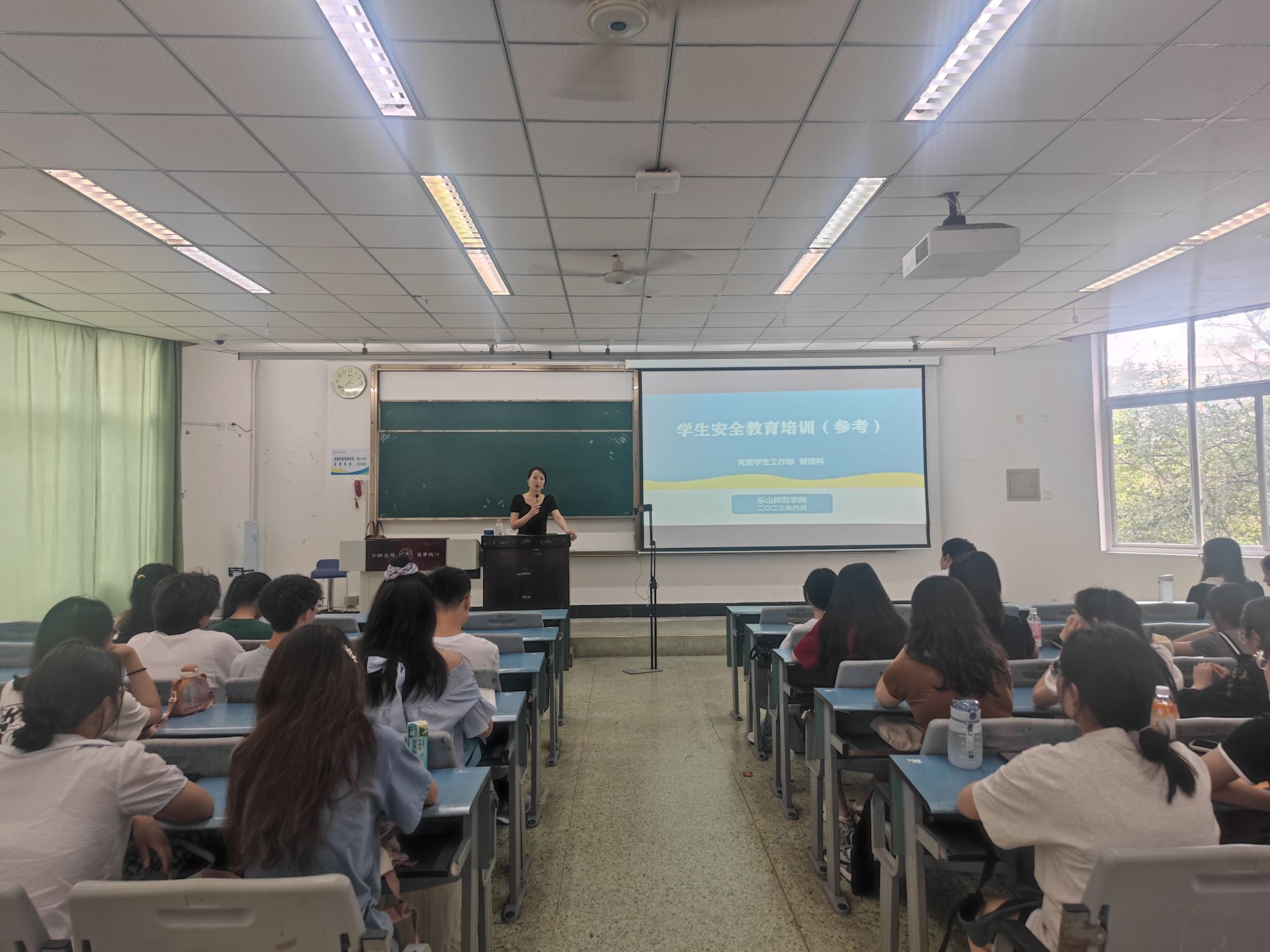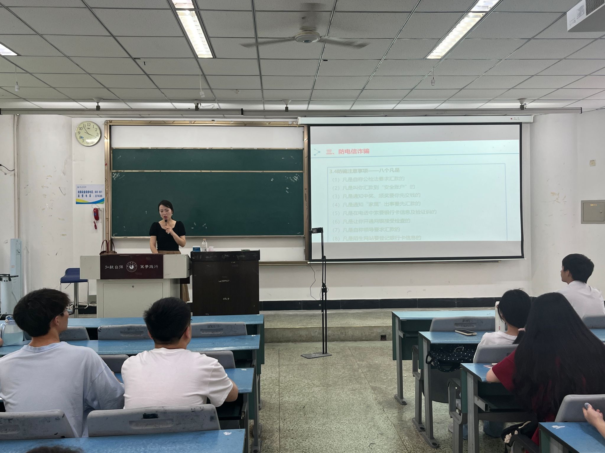 左莉围绕宿舍消防安全,防溺水安全,防电信诈骗,套路贷(校园贷),防控盗窃、伪造、买卖国家机关证件行为,传播网络舆情等方面作了详细阐述,其中,就防溺水、伪造国家机关证件、电信诈骗三方面作了重点阐述。关于防溺水问题,她以讲道理、摆事实的形式,告诫学生不要私自下河游泳。由于学生防溺水意识薄弱而引发悲剧的案例历年都存在,她希望同学们要珍爱生命,增强自身安全意识,远离存在安全隐患的水域,防止此类事件发生。关于电信诈骗问题,她从发生在同学们身边的诈骗案例入手,讲述了不法分子的作案手段,希望同学们不贪小便宜,不轻信各类中奖信息等,及时阻断骗局,不给不法分子留有空间。关于伪造、买卖国家机关证件行为,左莉通报了近期学生中存在的个案,希望同学们树立法治思维、筑牢法制底线、增强法制观念,坚决不做违法犯罪的事情,做一个知法、懂法、守法的合格公民和合格大学生。
