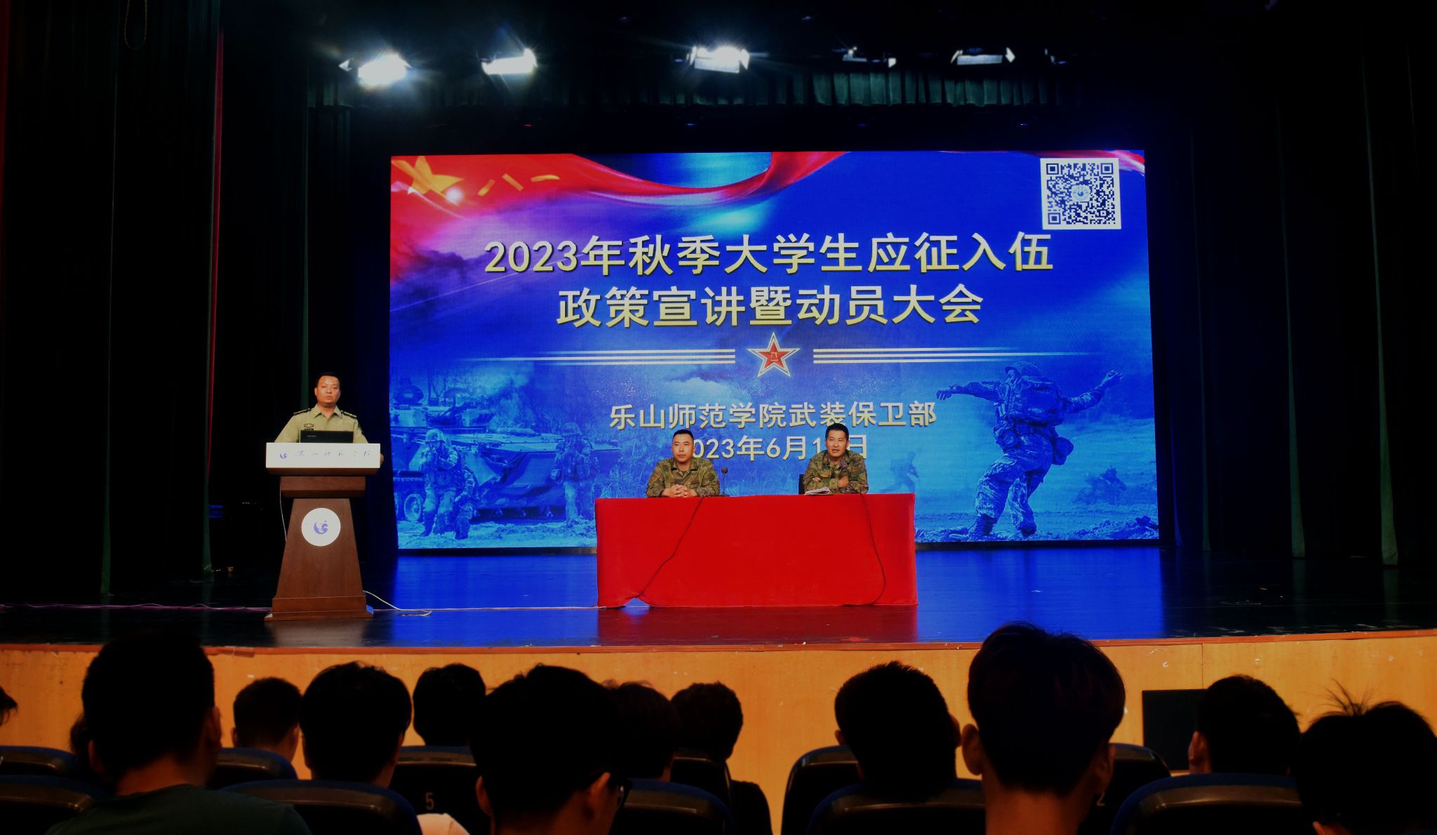 本网讯(文/刘明 图/徐凌云)为进一步深入开展学习贯彻习近平新时代中国特色社会主义思想主题教育,全面贯彻党的二十大精神和习近平强军思想,激发更多优秀青年学子参军入伍,报效祖国,6月12日上午,党委武装保卫部在实训楼多功能厅召开2023年秋季大学生应征入伍政策宣讲暨动员大会。乐山军分区动员处副处长廖博应邀宣讲,乐山市市中区武装部保障科科长张凯、国防教育科、2019级辅导员、各教学院2019级男生及有应征入伍意愿学生代表参加。宣讲会由党委武装部副部长梁光德主持。