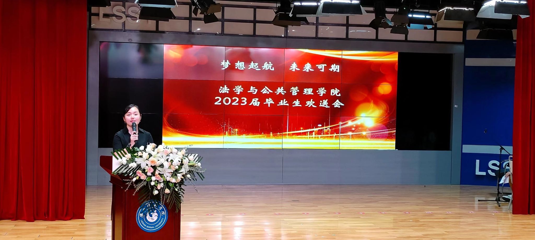 本网讯(文/江琳 图/叶烩)6月12日晚,法学与公共管理学院在旷怡楼多功能厅举办“梦想启航,未来可期”2023届毕业生欢送会。法管学院党委书记程勇、院长苏祥、副书记翟雅媛、副院长刘克稳、赵勇、学生管理科科长杨兵、教师代表、全体辅导员及2023届200余名毕业生参加了此次活动。欢送会由翟雅媛主持。