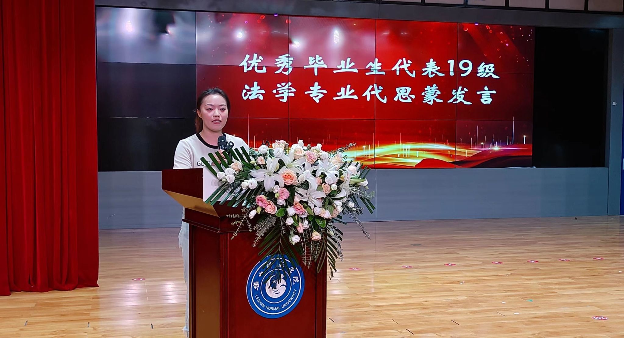 优秀毕业生代表法学专业代思蒙同学分享了自己的成长故事并代表所有毕业生向学院全体老师们的辛勤付出表示衷心的感谢。在感恩师恩环节,毕业生代表们为教师代表献上献花,送上祝福,以表达对老师们感激。