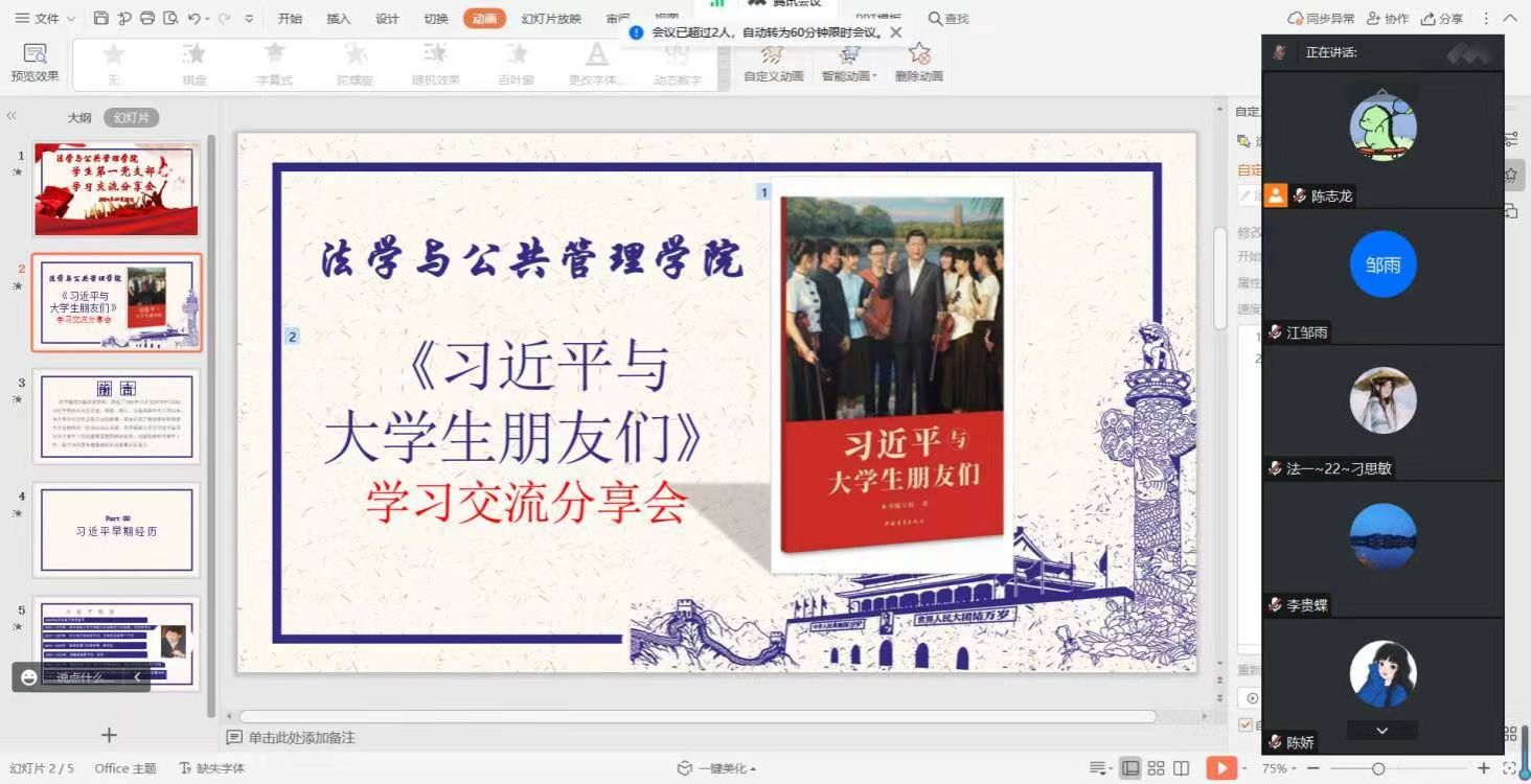 本网讯(文/何叶 图/李国清)为了引导广大学生党员准确把握新时代下中国特色社会主义发展方向,以学术研究、经验分享和互动交流的形式,探讨如何更好地发挥大学生党员的先锋模范作用,为推进中国特色社会主义事业做出积极贡献,法学与公共管理学院学生党支部,于2023年6月22日在腾讯会议上展开一场大学生党员同志学习《习近平与大学生朋友们》的学习交流分享会。