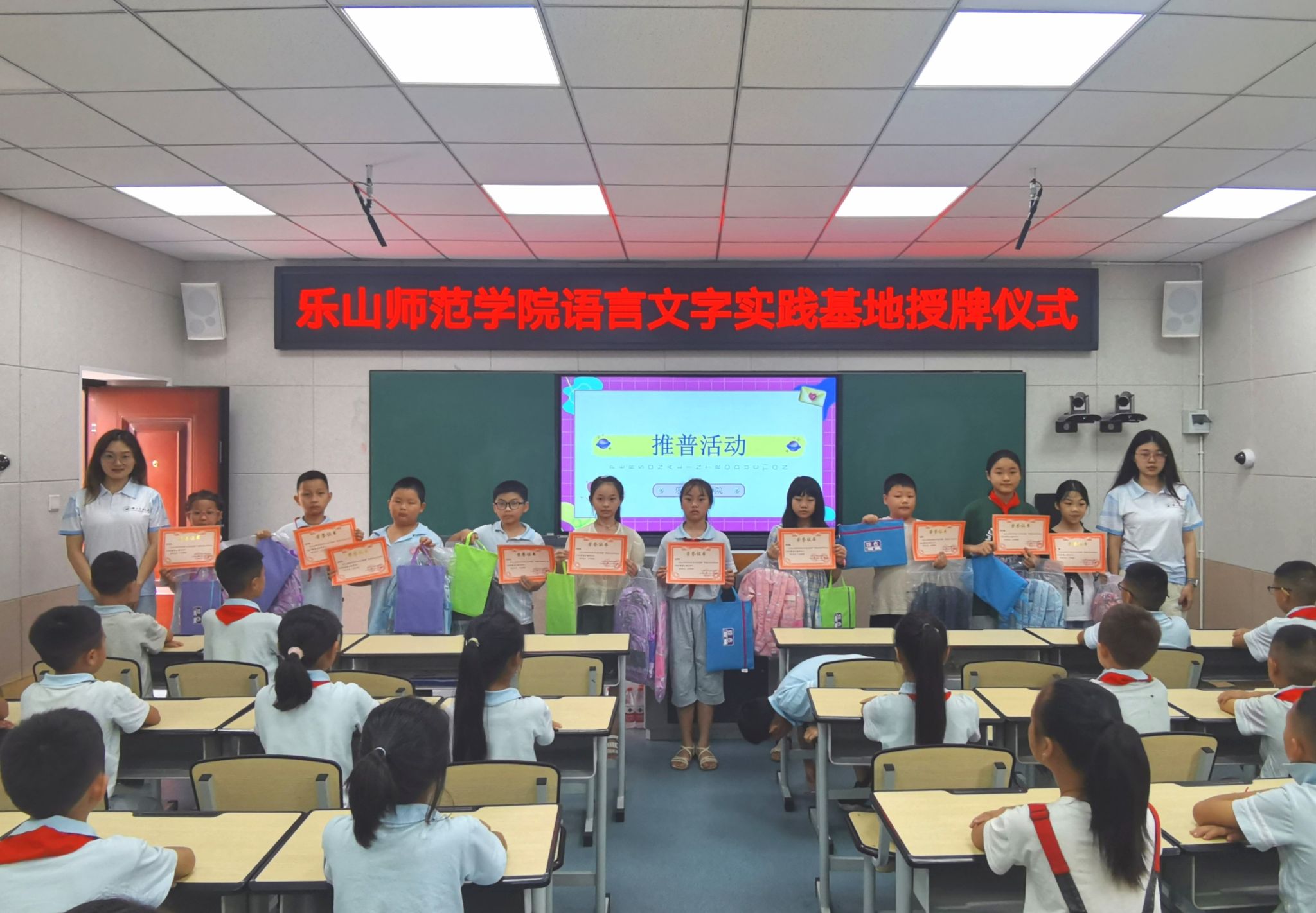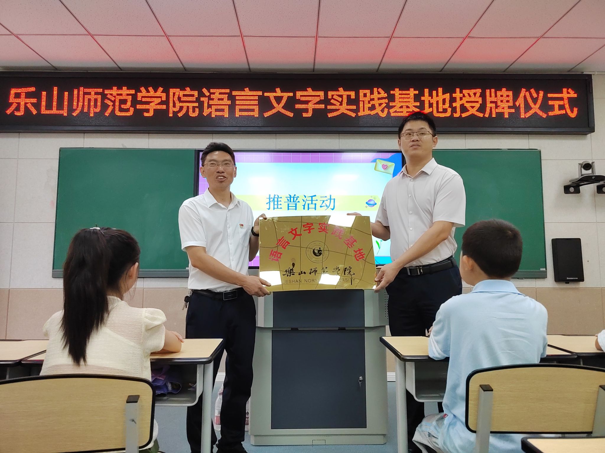 本网讯(文、图/陈怡洁)为深入学习贯彻习近平新时代中国特色社会主义思想主题教育,助力乡村振兴,推进普通话全面普及,7月2日上午,“世界杯葡萄牙vs加纳波胆预测 语言文字实践基地”授牌仪式在乐山市峨边彝族自治县县街小学顺利举行。峨边彝族自治县县街小学童仕林校长、世界杯葡萄牙vs加纳波胆预测 教师教育学院胡涛、文学与新闻学院钟蕾、田青及三名推普志愿者同县街小学五十余名同学参加仪式。世界杯葡萄牙vs加纳波胆预测 教师教育学院胡涛为语言文字实践基地代表授牌,峨边彝族自治县县街小卡塔尔世界杯决赛波胆预测 长童仕林接受牌匾。童仕林向同学们展示所受牌匾内容,告诉同学们学习普通话的重要性,激励同学们认真、踏实地学习普通话。