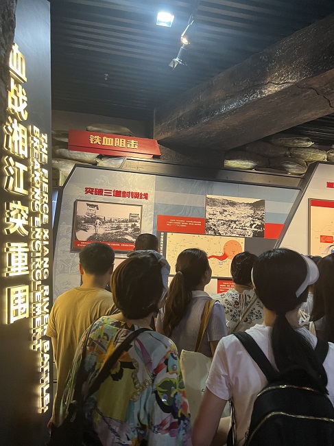 接着到达湖南通道转兵纪念馆,在这里,老师们了解到该馆整个陈列布展分战略转移、通道转兵、走向胜利、红色印记四大板块,围绕“缅怀革命先烈、传承长征精神”这一主题,采用了图文、绘画、雕塑、沙盘、声光电、情景复原等手法,真实客观地再现了红军长征“通道转兵”这一辉煌历史。1934年12月,中国工农红军长征途径湖南通道,召开了通道会议,决定转道贵州。通道转兵,是实现长征伟大转折的开端。